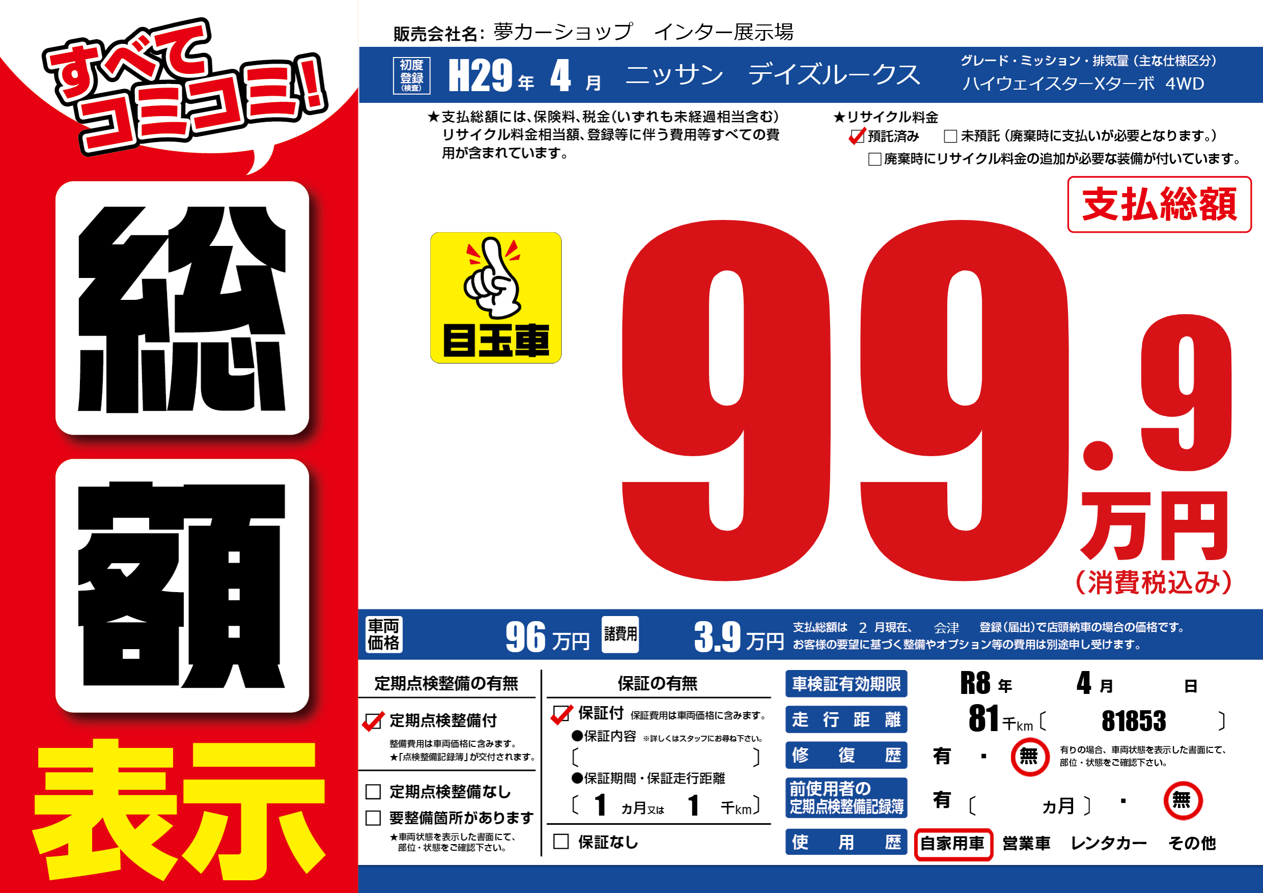 | 車名 | ニッサン デイズルークス | グレード ミッション 排気量 |
