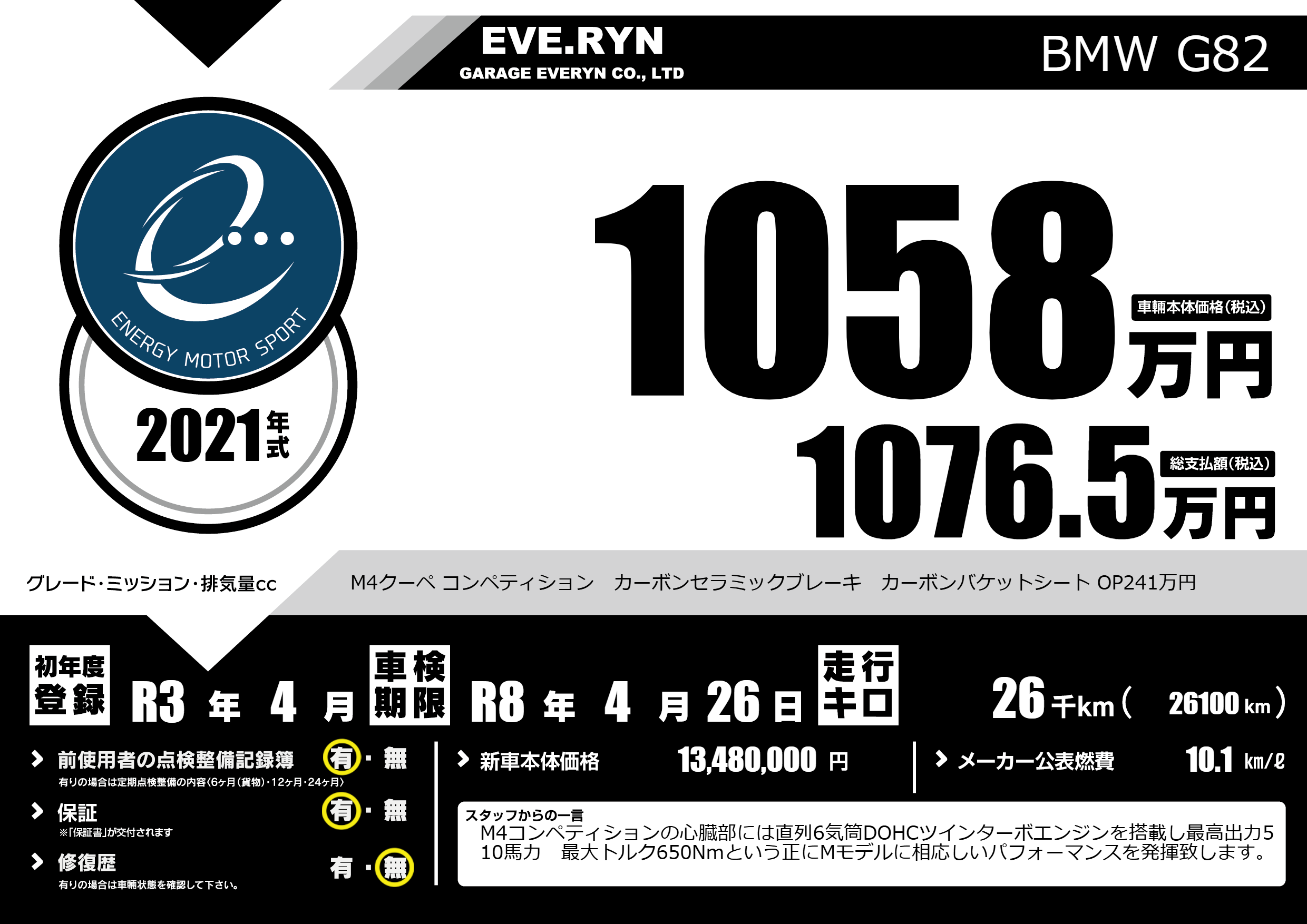 | 車名 | BMW G82 | グレード ミッション 排気量 |