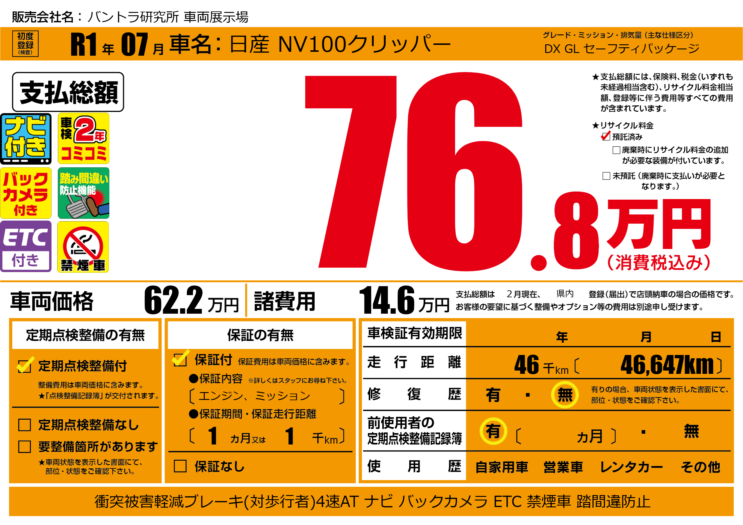 | 車名 | 日産 NV100クリッパー | グレード ミッション 排気量 |