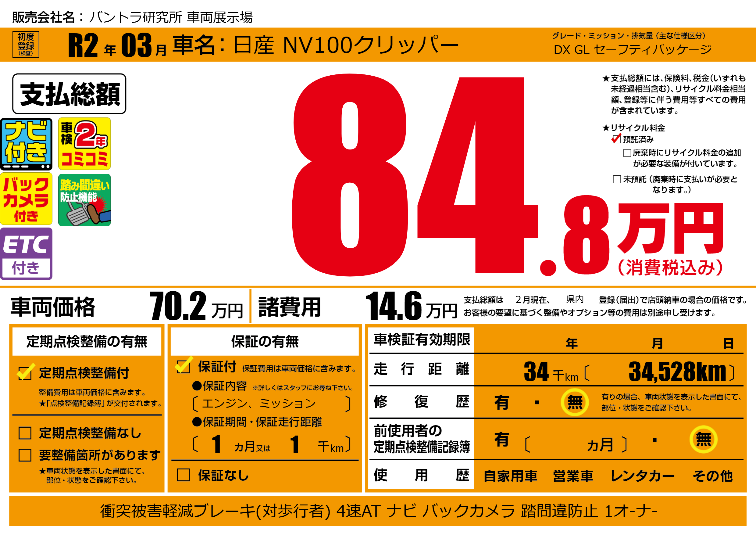 | 車名 | 日産 NV100クリッパー | グレード ミッション 排気量 |