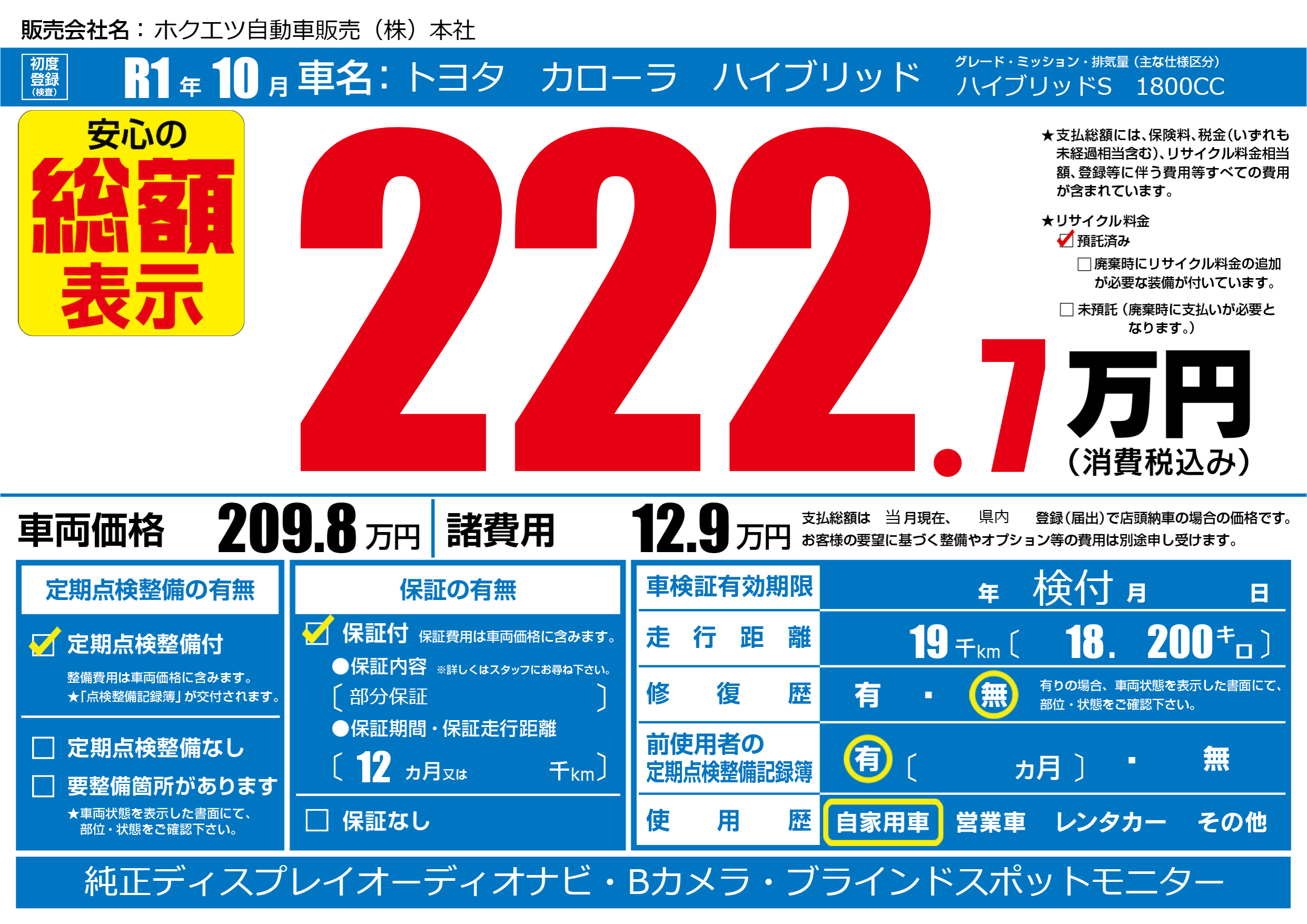 | 車名 | トヨタ カローラ ハイブリッド | グレード ミッション 排気量 |