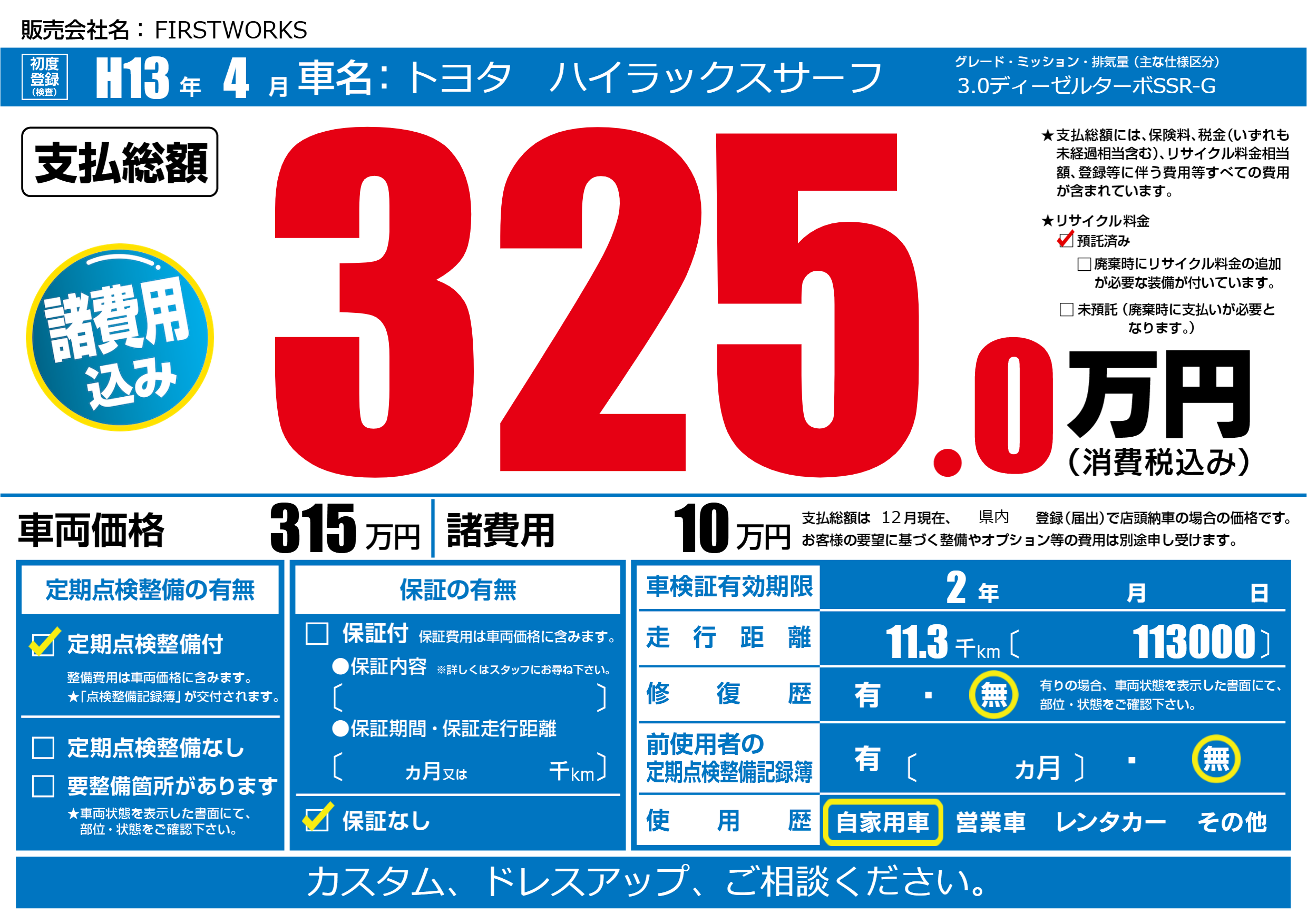 | 車名 | トヨタ ハイラックスサーフ | グレード ミッション 排気量 |