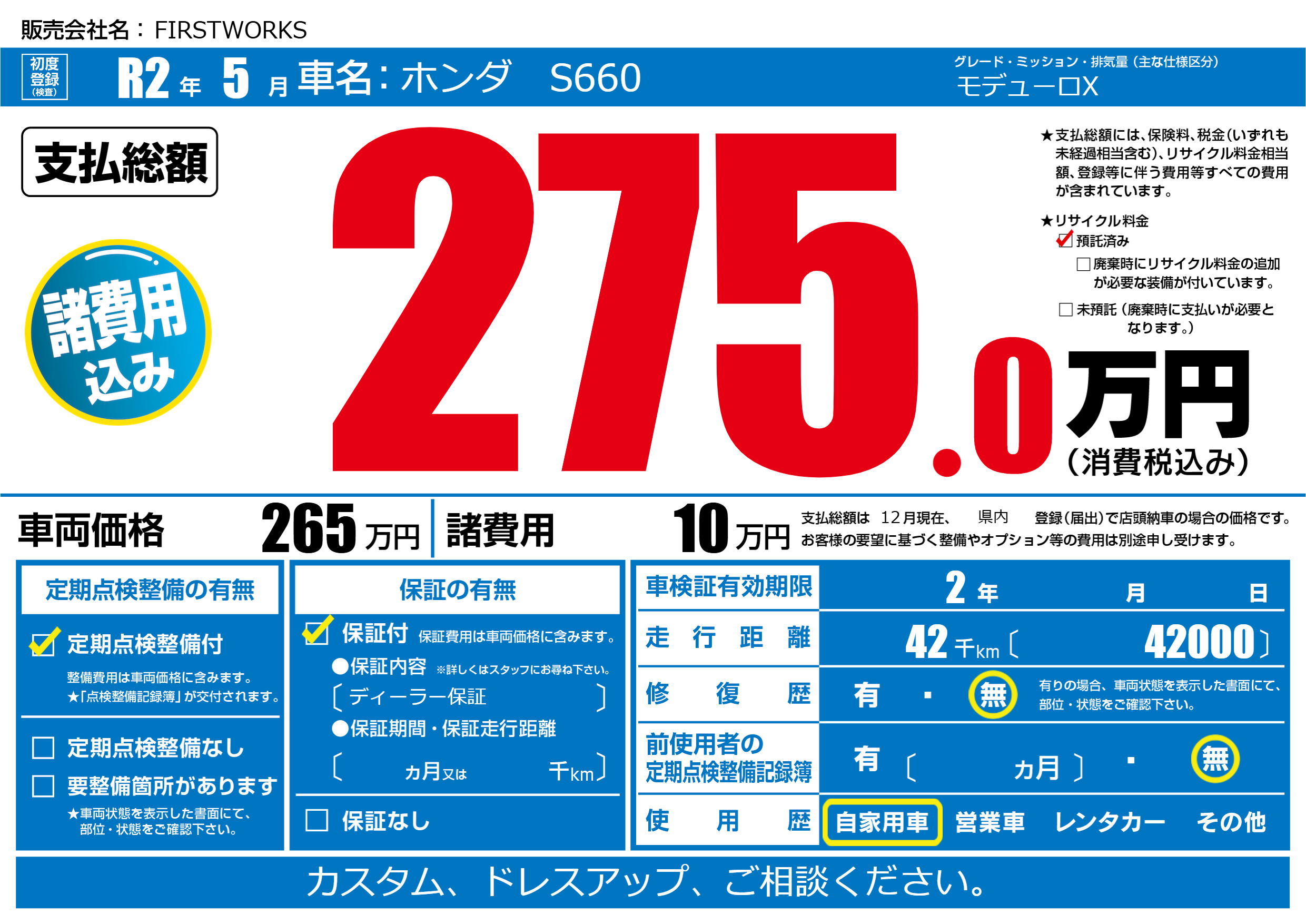 | 車名 | ホンダ S660 | グレード ミッション 排気量 |