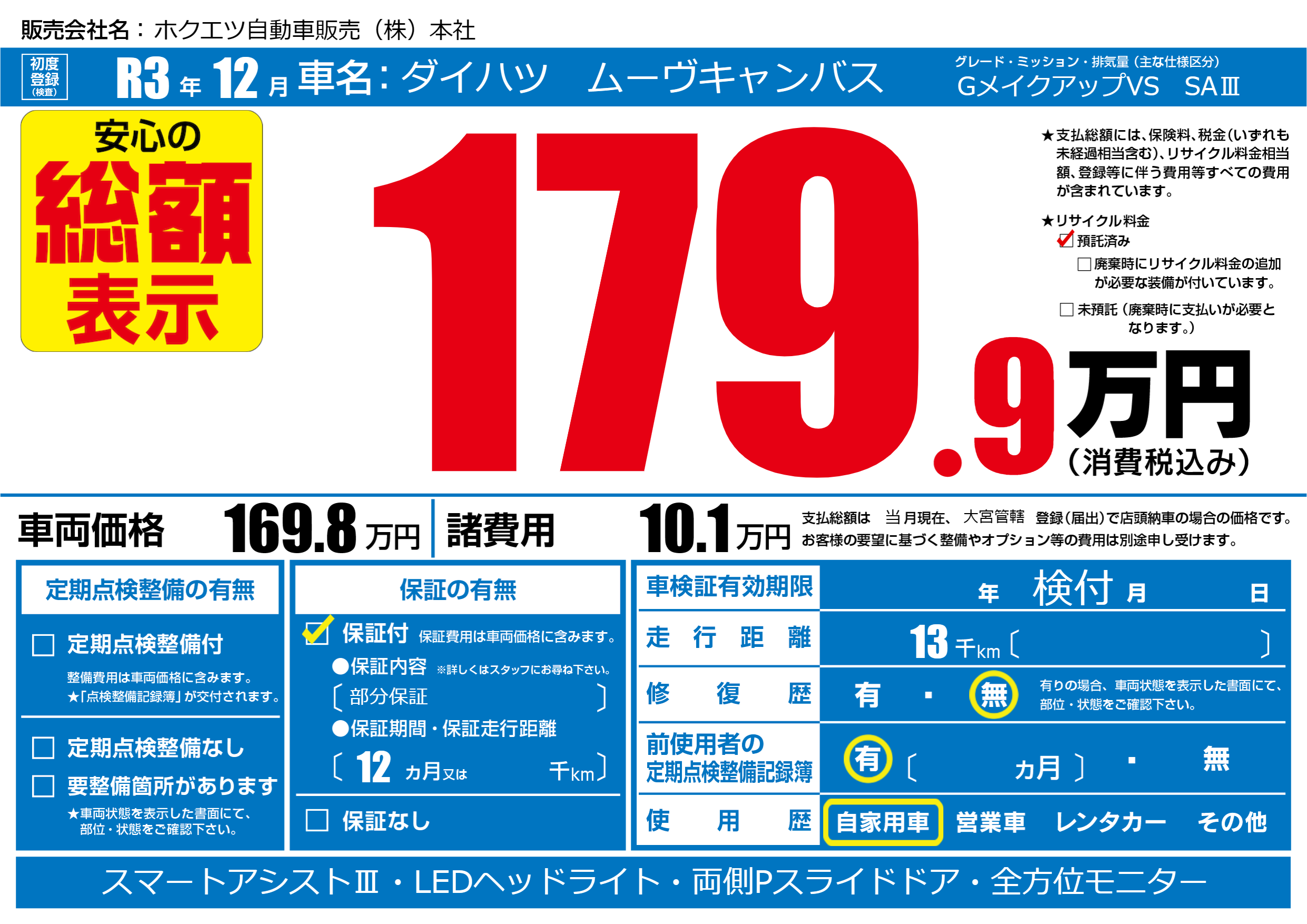 保証付き 保証内容(部分保証) 12ヶ月または()千kmまで |