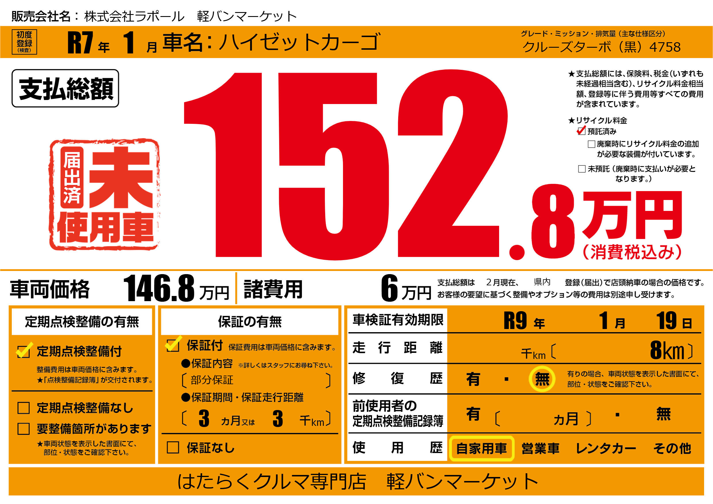 | 車名 | ハイゼットカーゴ | グレード ミッション 排気量 |