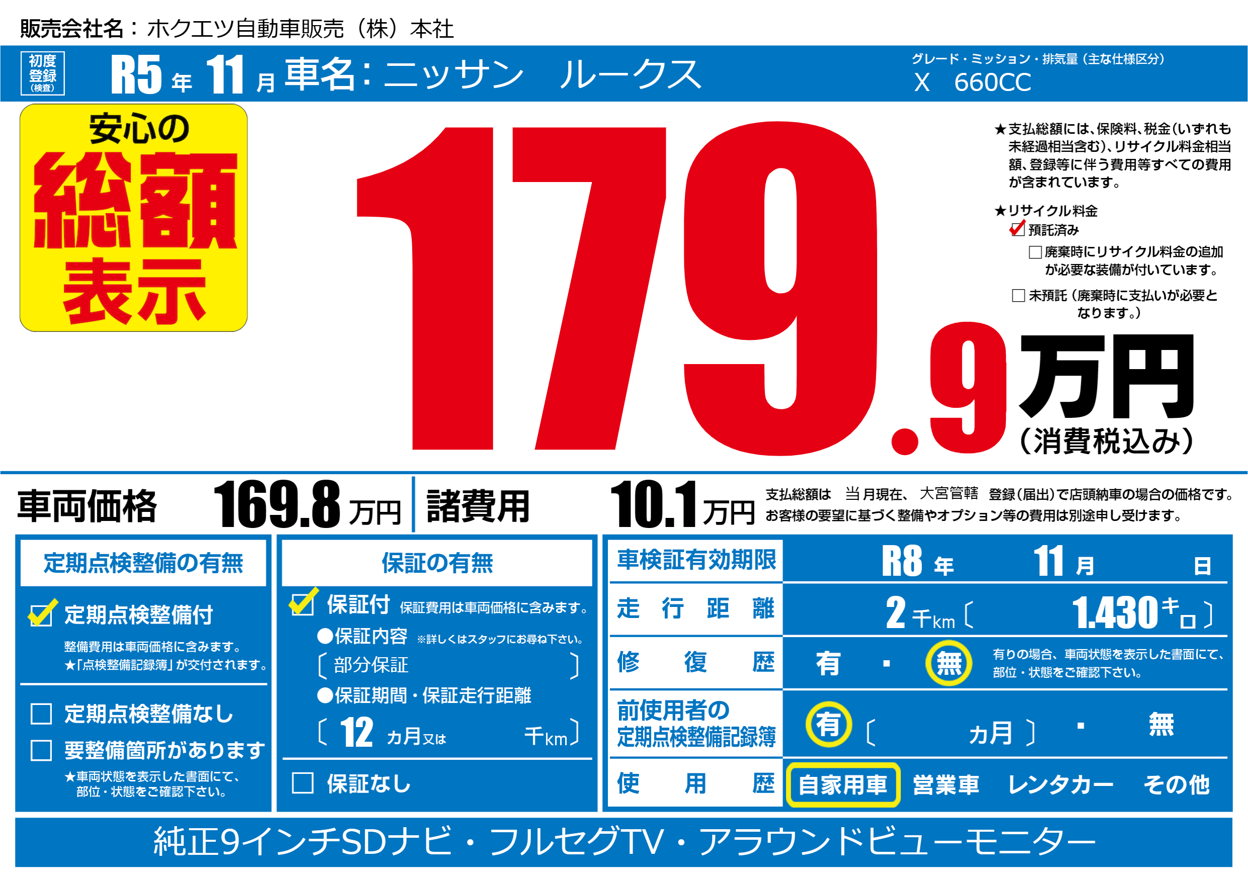 | 走行キロ | 0.2万km | 初年度登録 | R5年11月 |