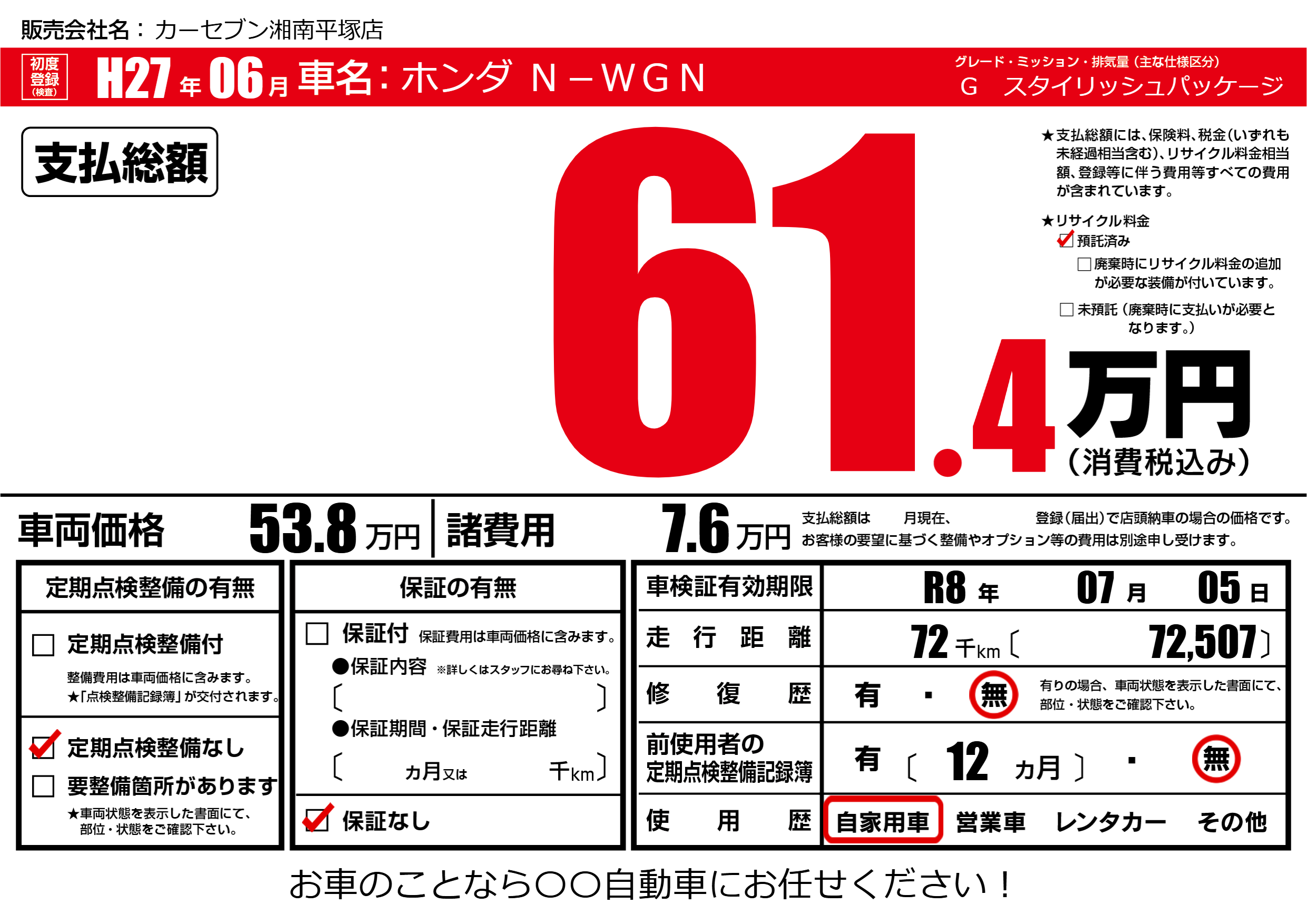 | 車名 | ホンダ N-WGN | グレード ミッション 排気量 |