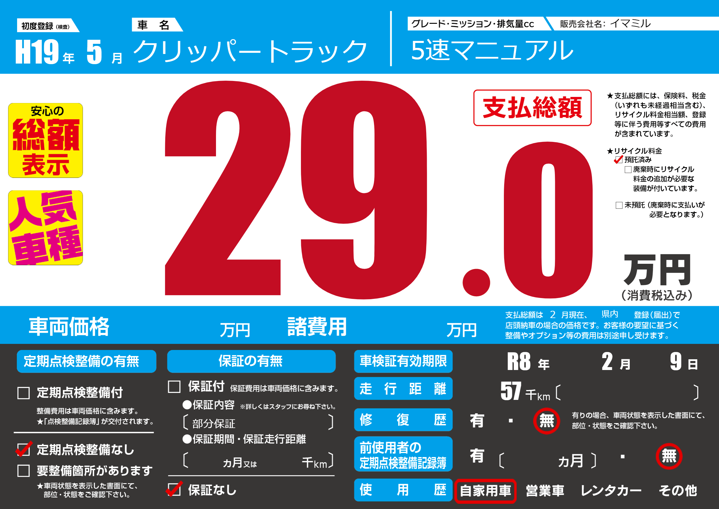 | 車名 | クリッパートラック | グレード ミッション 排気量 |