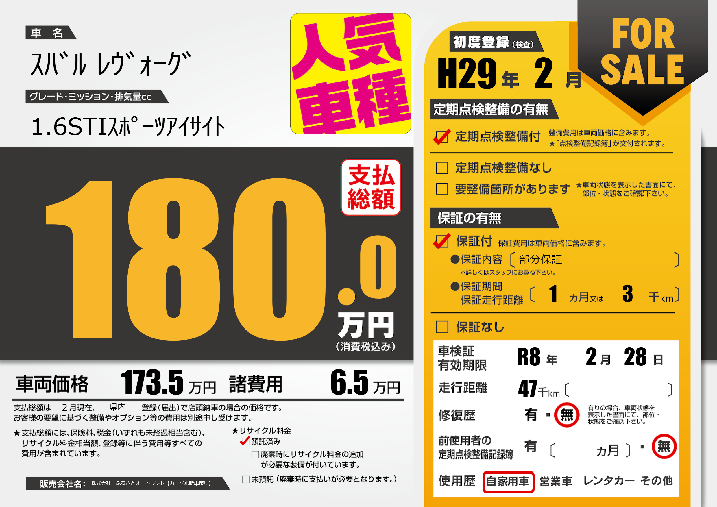 | 車名 | スバル レヴォーグ | グレード ミッション 排気量 |