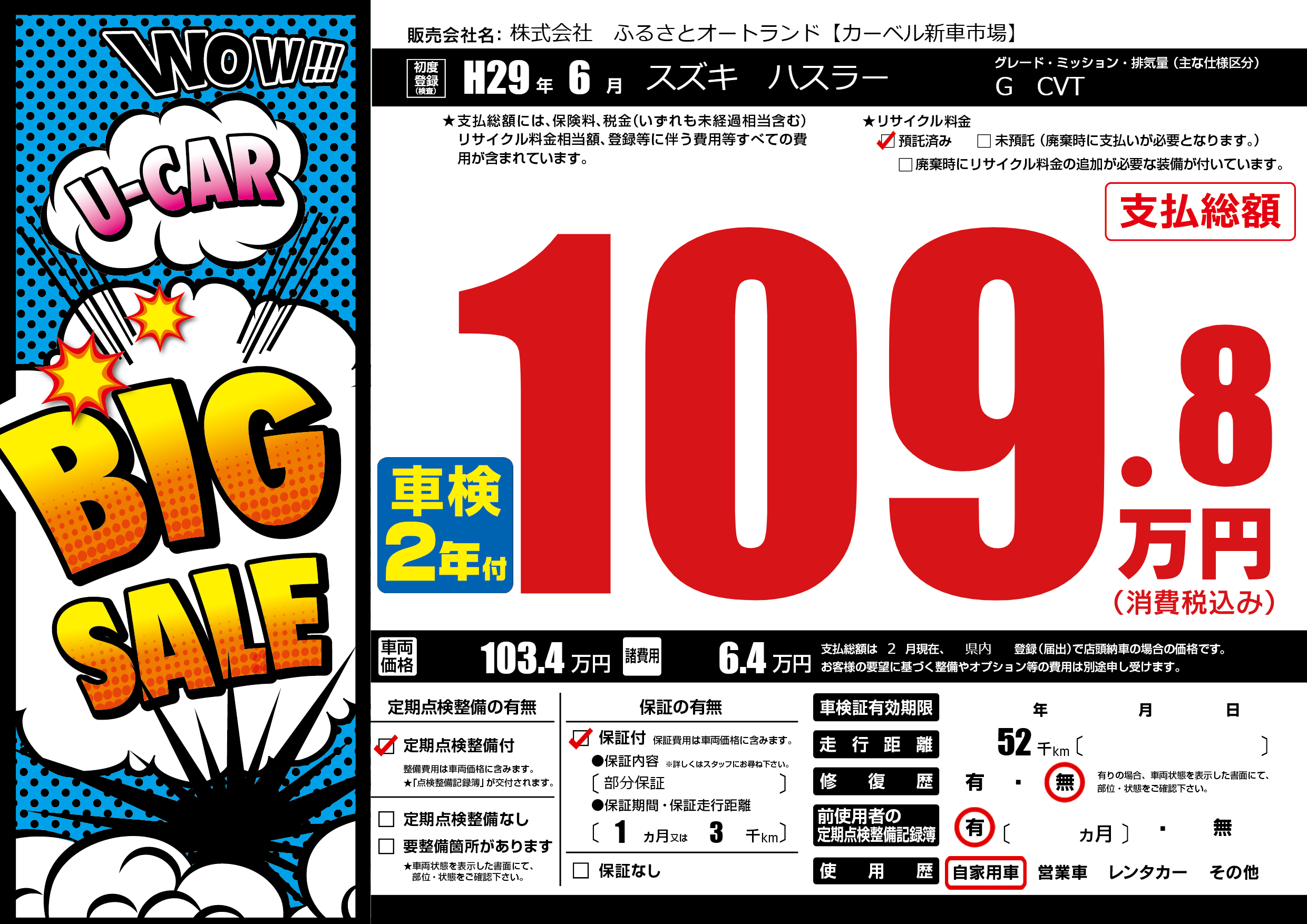 | 車名 | スズキ ハスラー | グレード ミッション 排気量 |