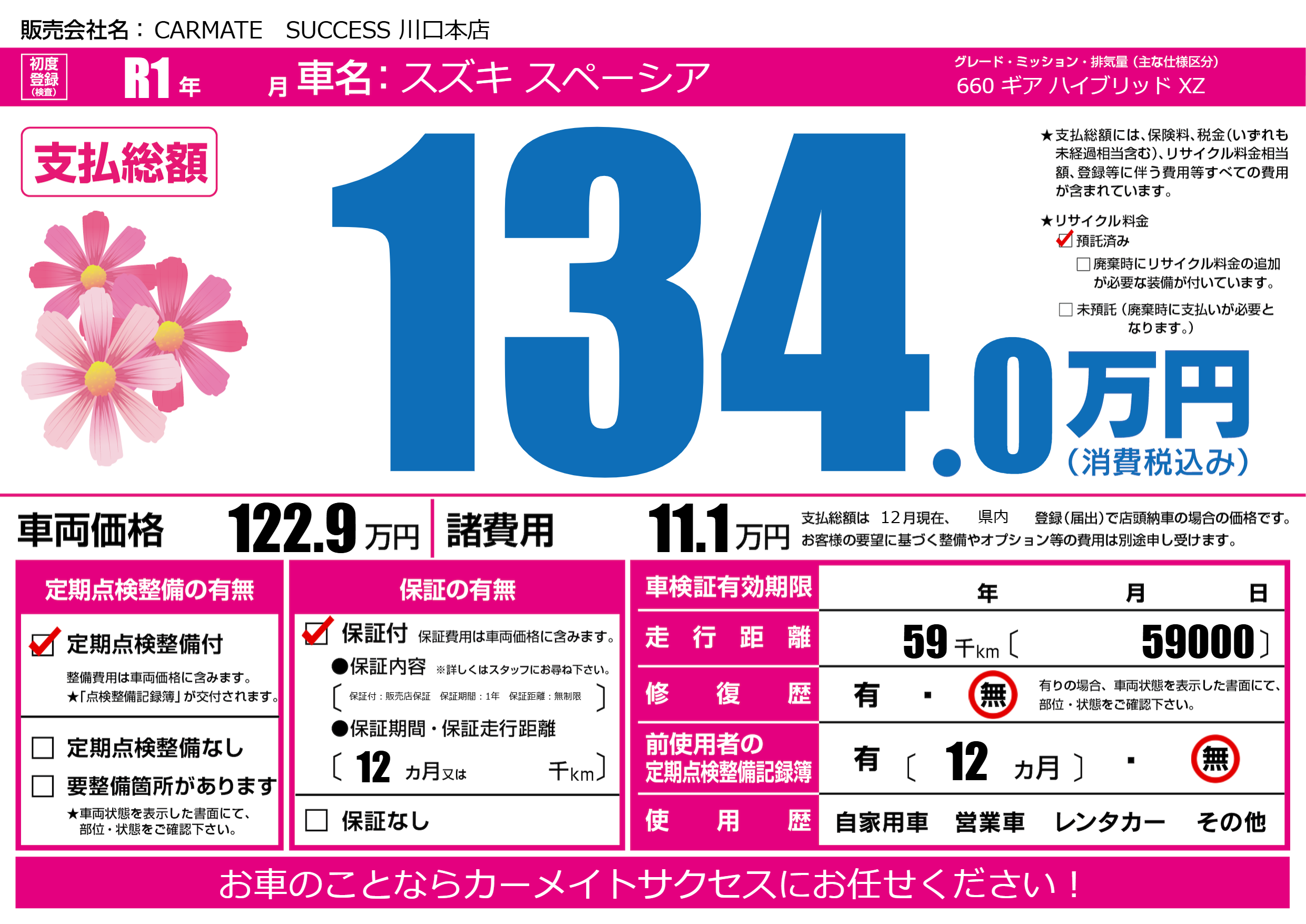 | 車名 | スズキ スペーシア | グレード ミッション 排気量 |