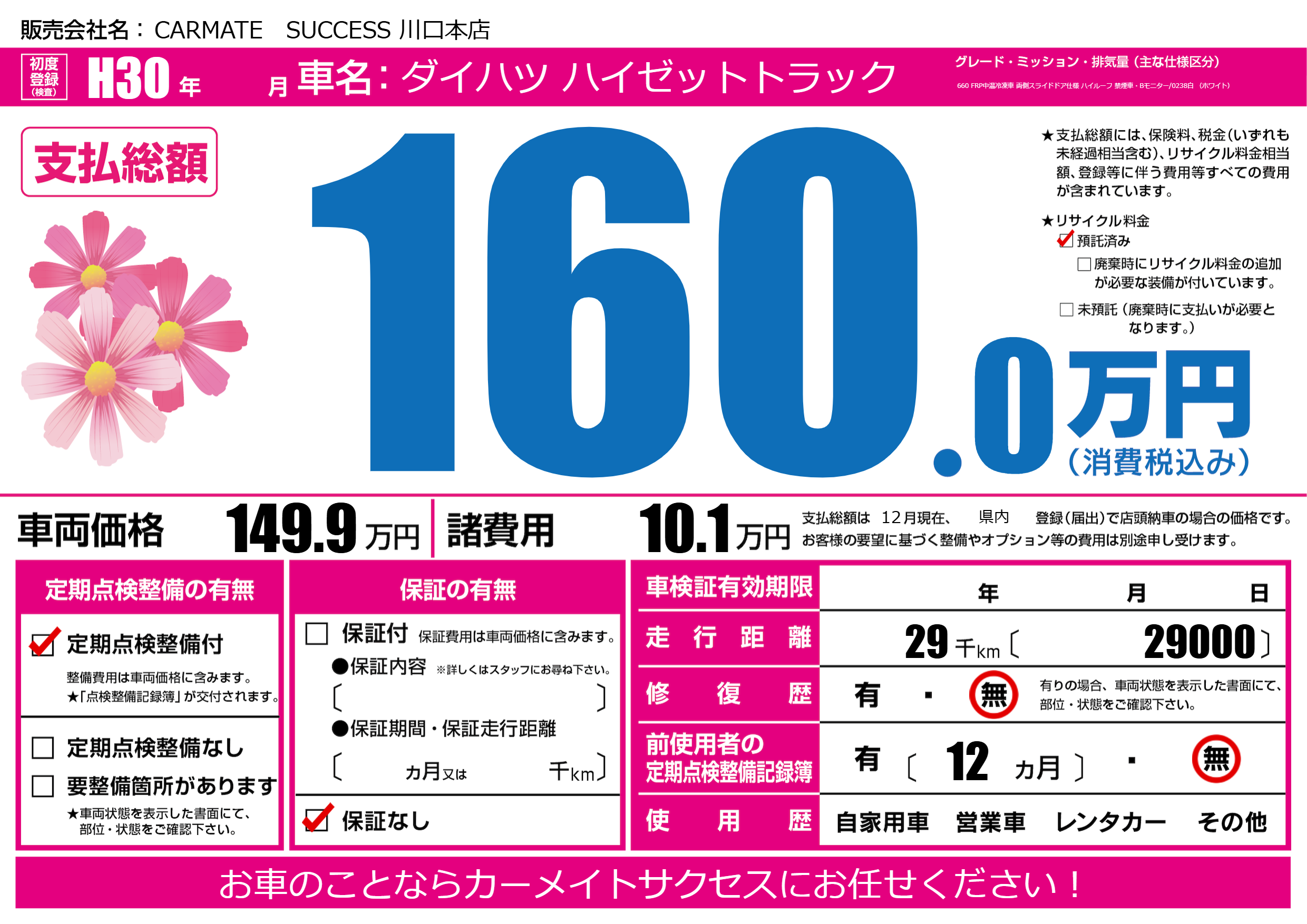 | 走行キロ | 2.9万km | 初年度登録 | H30年---月 |