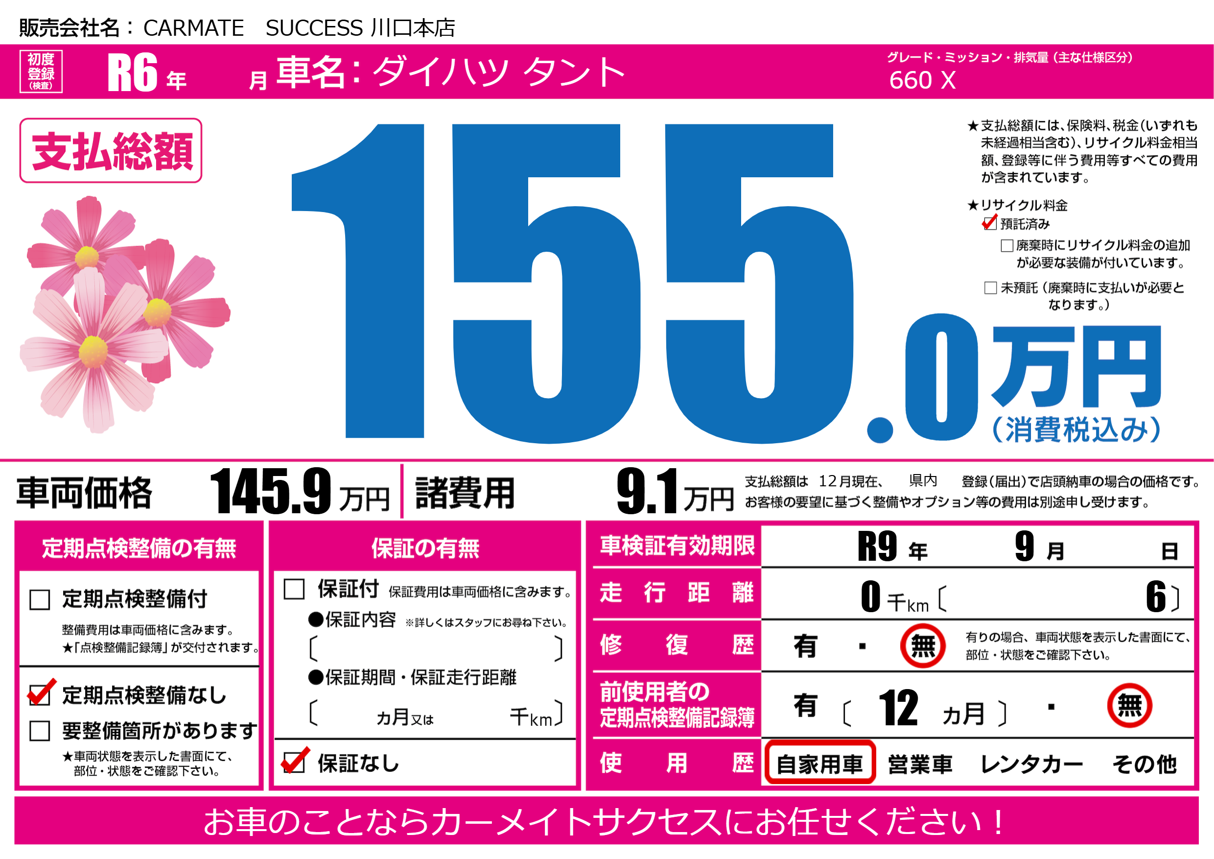 | 車名 | ダイハツ タント | グレード ミッション 排気量 |