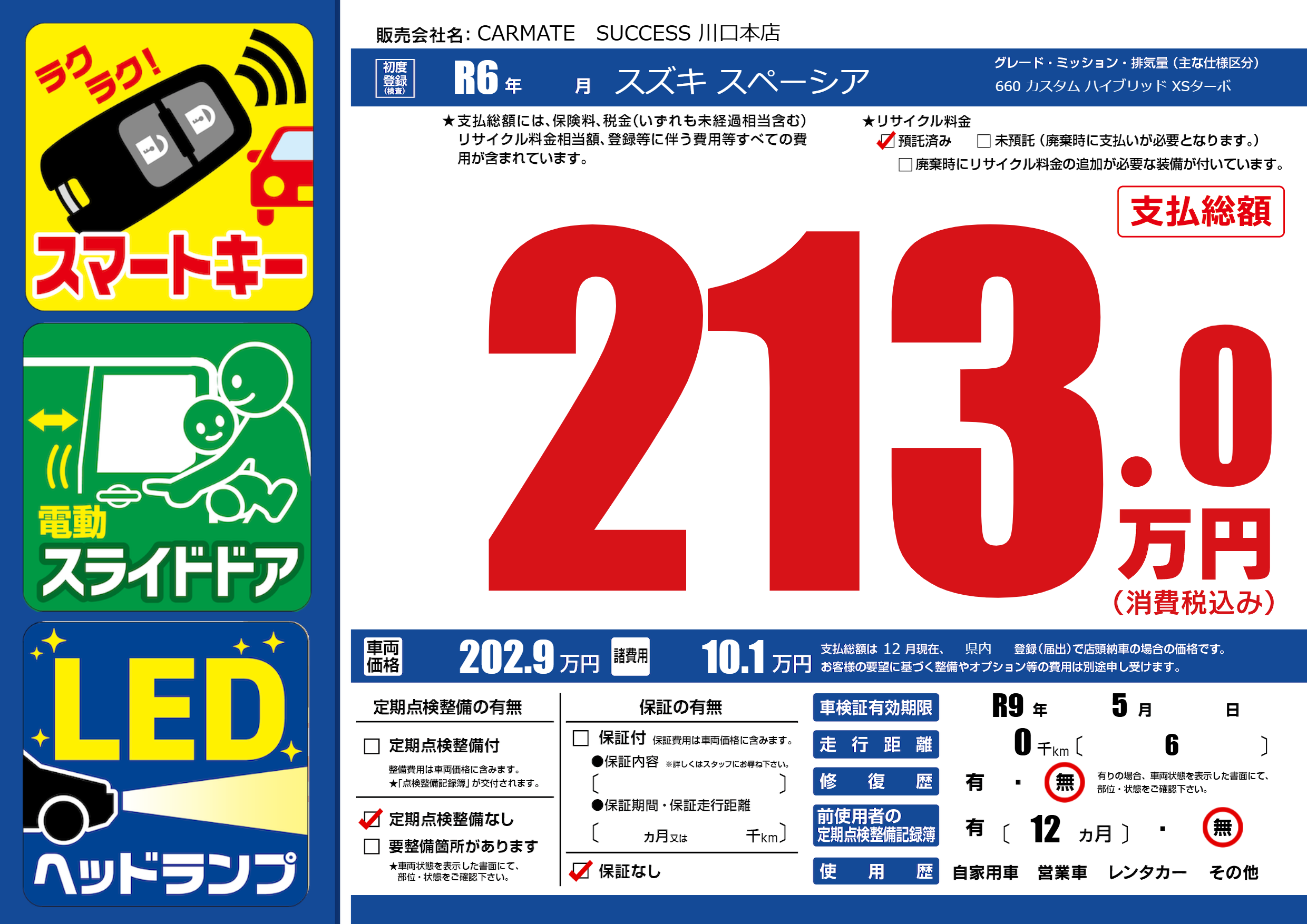 | 車名 | スズキ スペーシア | グレード ミッション 排気量 |