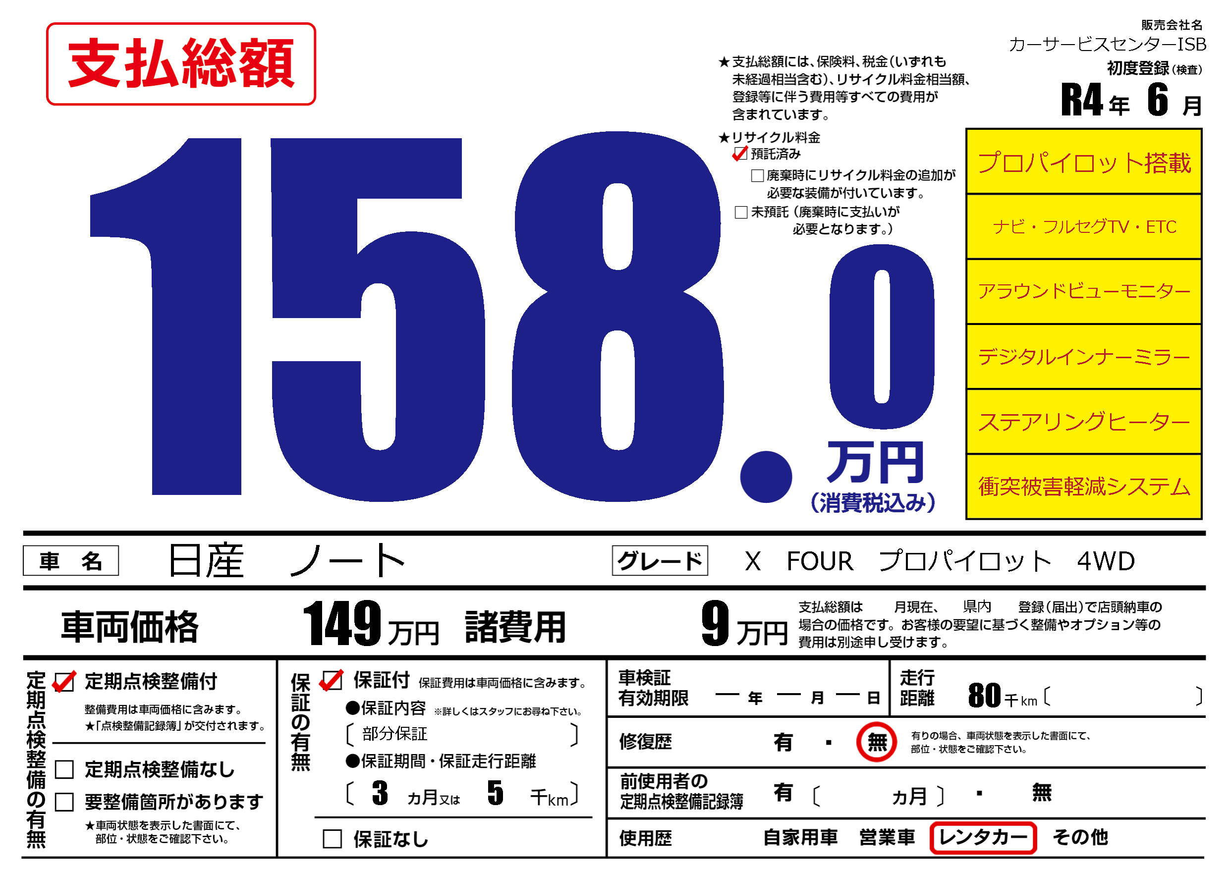 | 走行キロ | 8万km | 初年度登録 | R4年6月 |