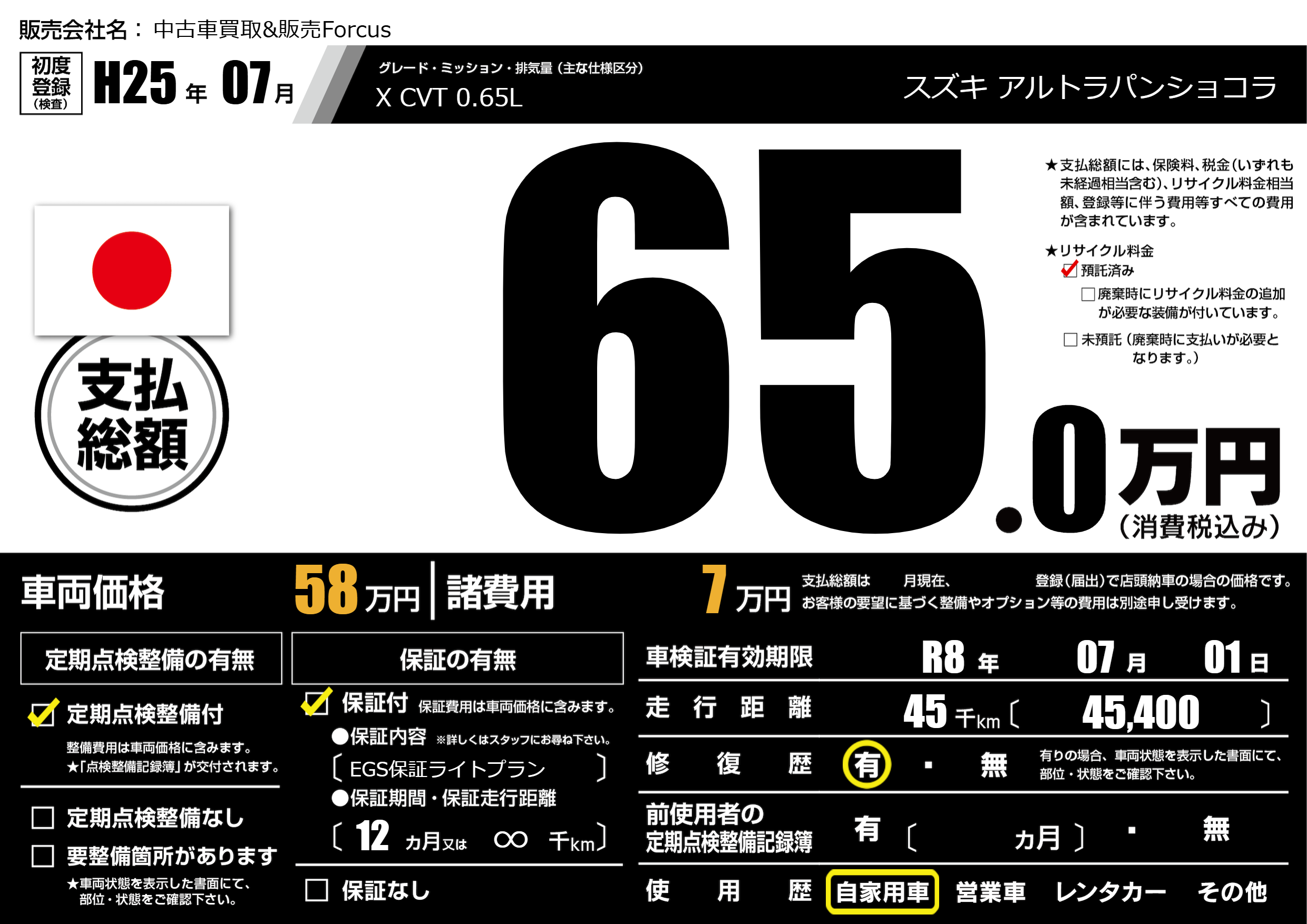 | 走行キロ | 4.5万km | 初年度登録 | H25年07月 |