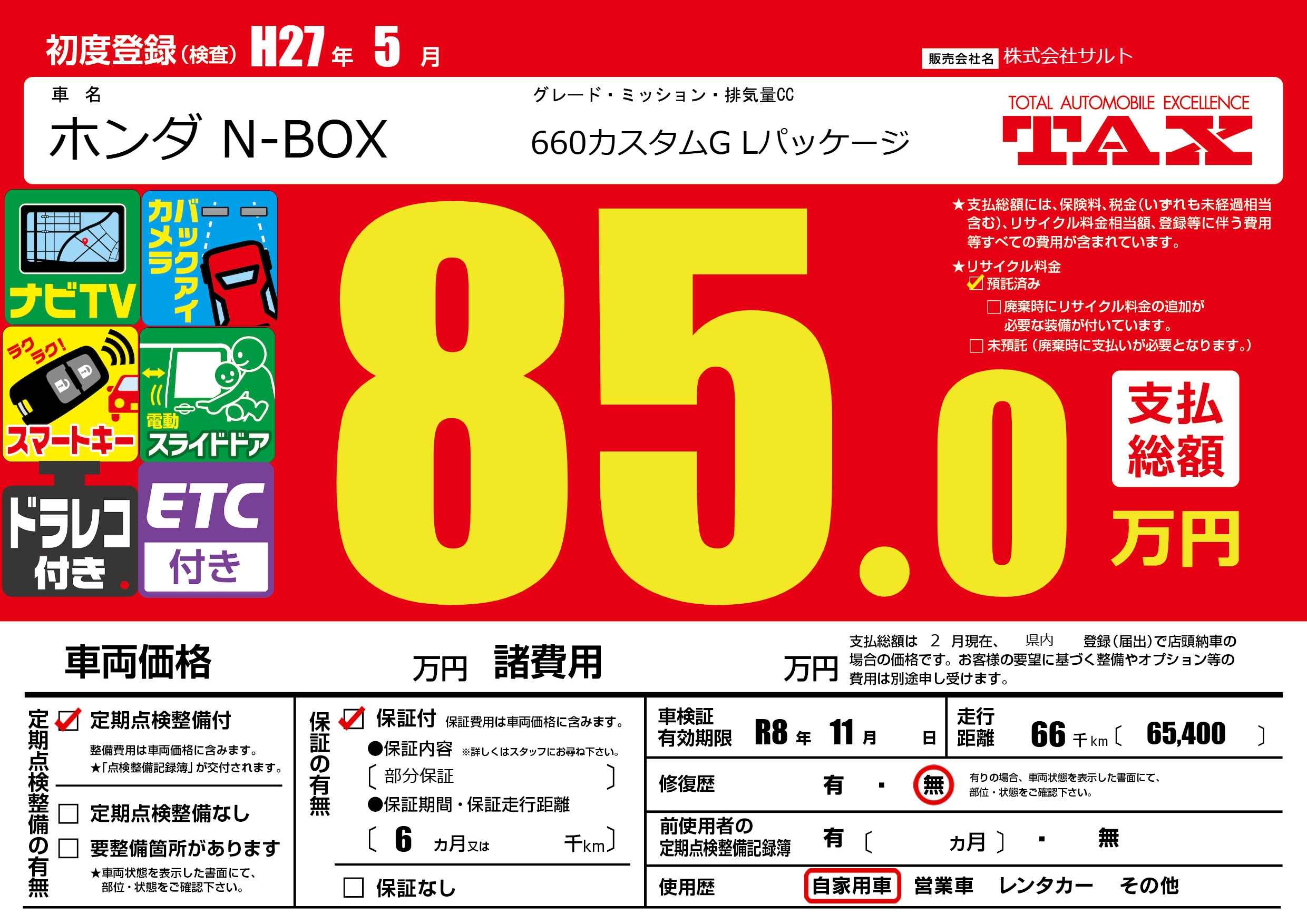 | 走行キロ | 6.6万km | 初年度登録 | H27年5月 |
