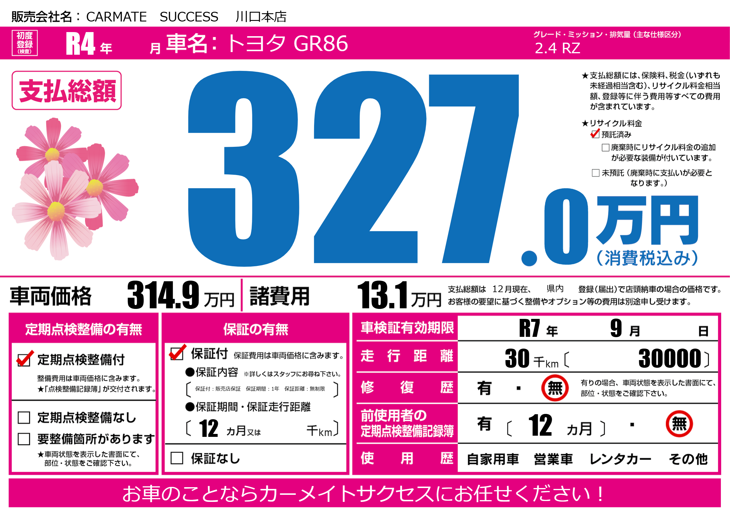 | 車名 | トヨタ GR86 | グレード ミッション 排気量 |