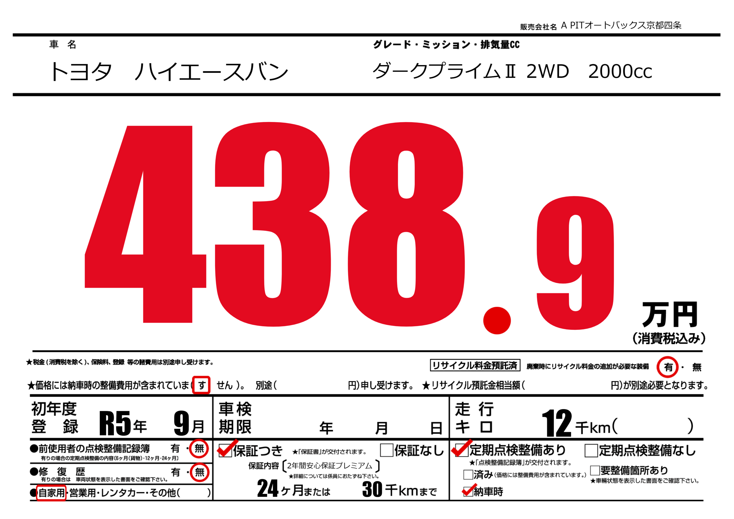 保証なし 保証内容(2年間安心保証プレミアム) 24ヶ月または(30)千kmまで |