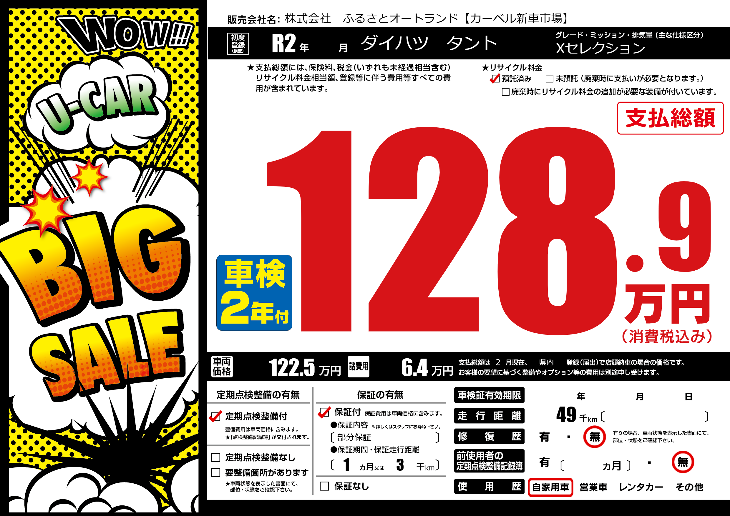 | 車名 | ダイハツ タント | グレード ミッション 排気量 |
