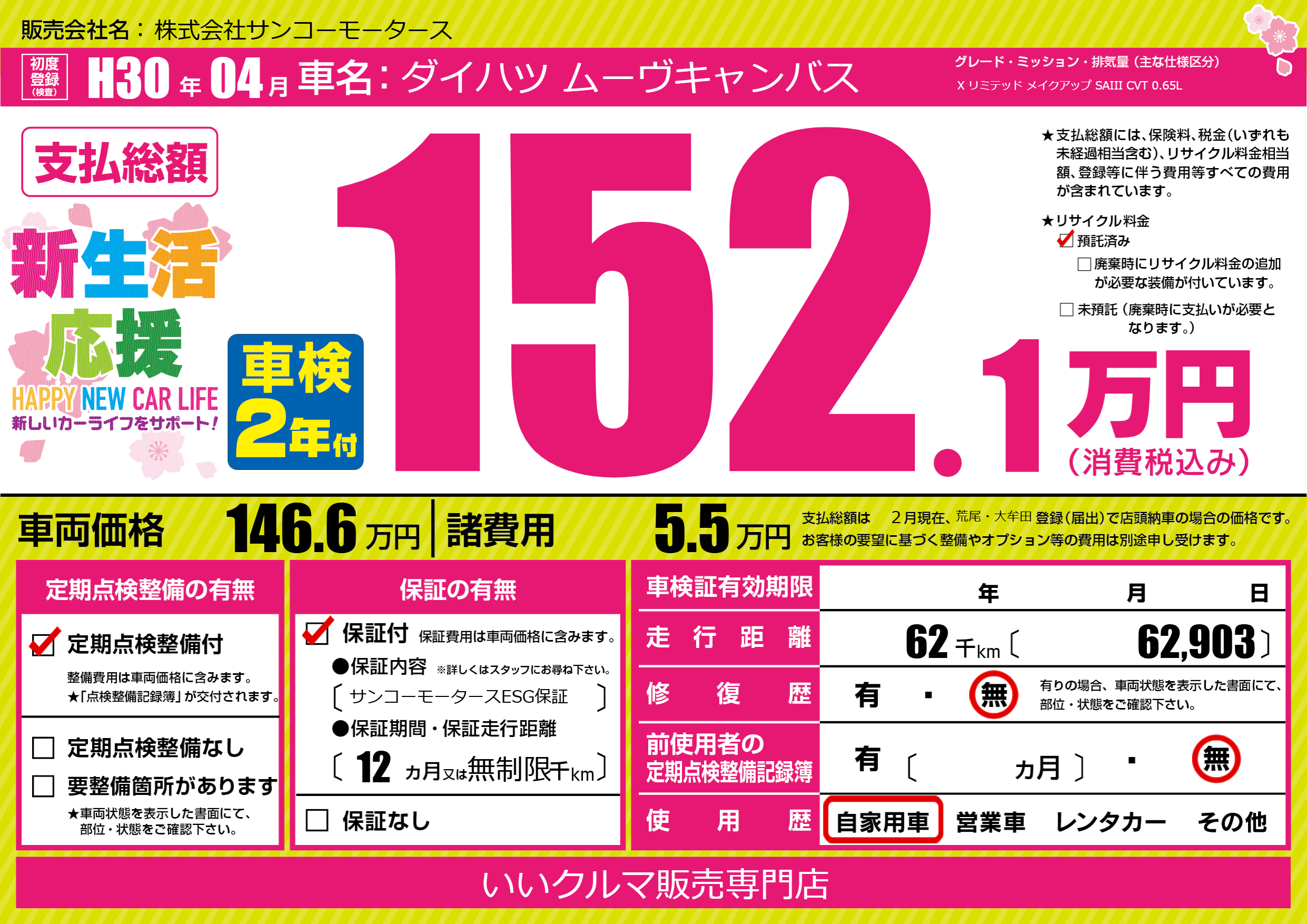 保証付き 保証内容(サンコーモータースESG保証) 12ヶ月または無制限千km |