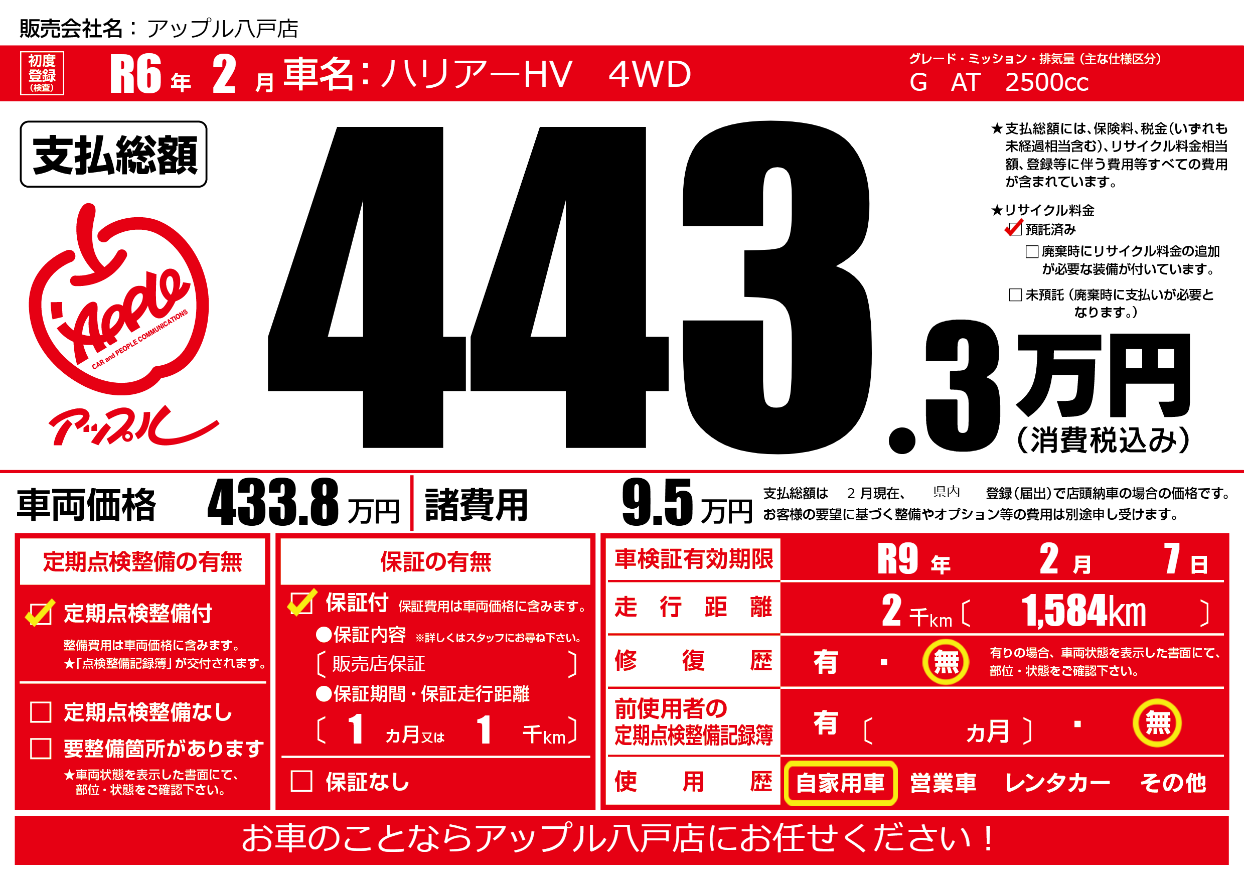 | 車名 | ハリアーHV 4WD | グレード ミッション 排気量 |