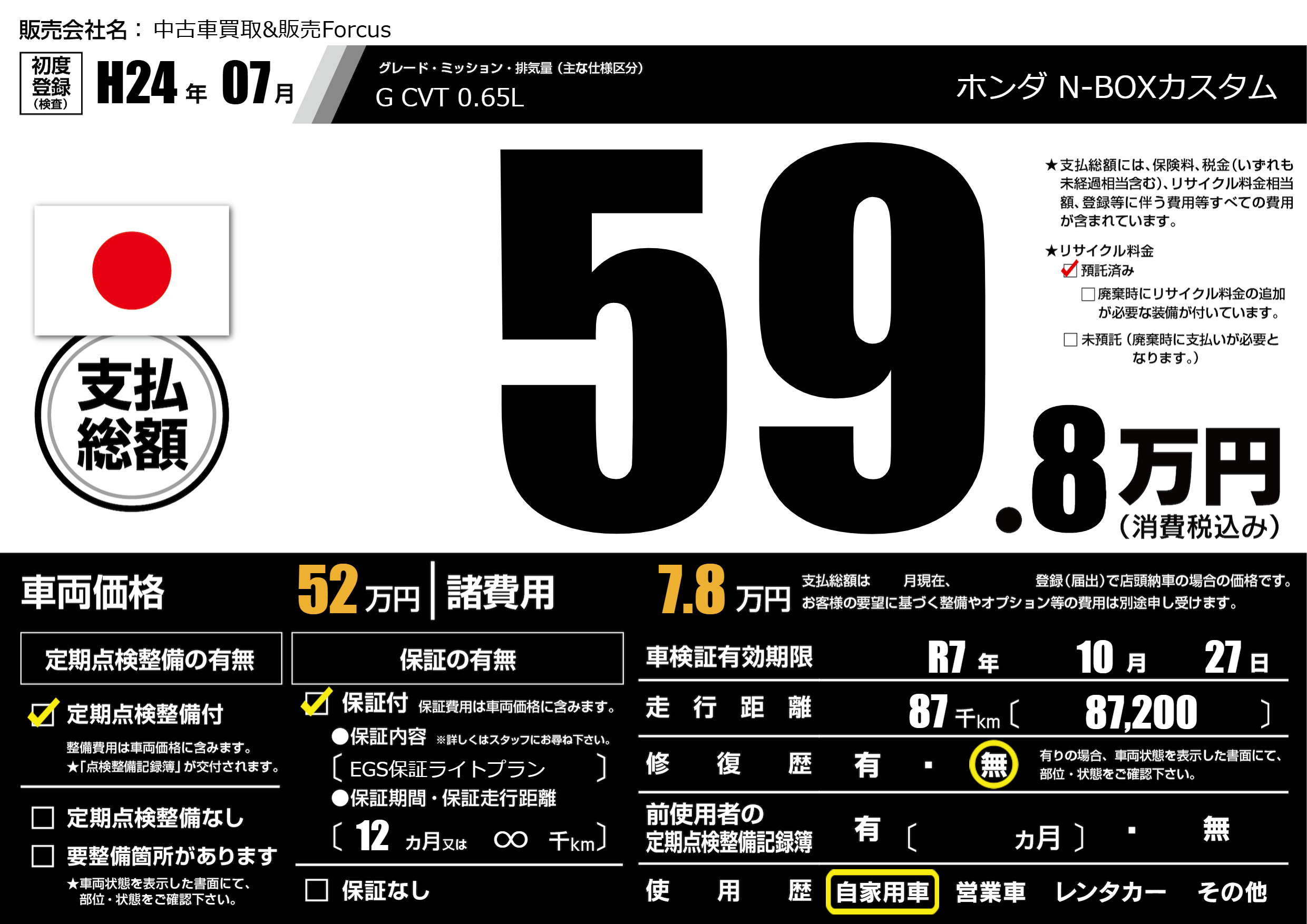 | 車名 | ホンダ N-BOXカスタム | グレード ミッション 排気量 |