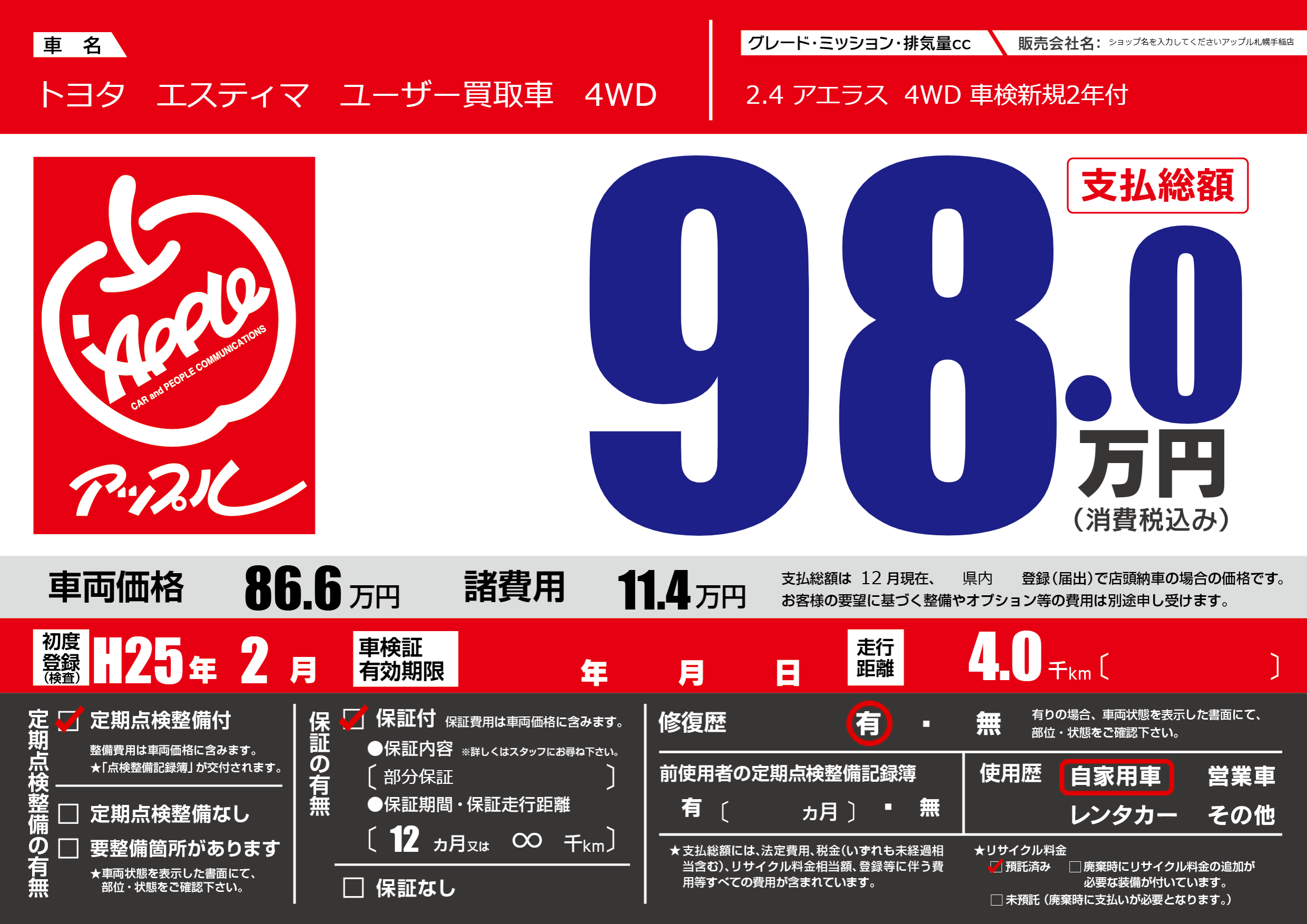 | 車名 | トヨタ エスティマ ユーザー買取車 4WD | グレード ミッション 排気量 |