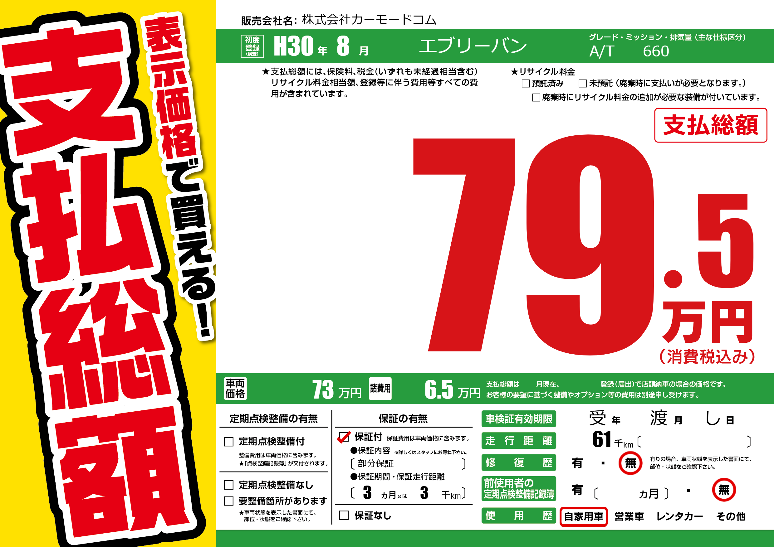 | 車名 | エブリーバン | グレード ミッション 排気量 |