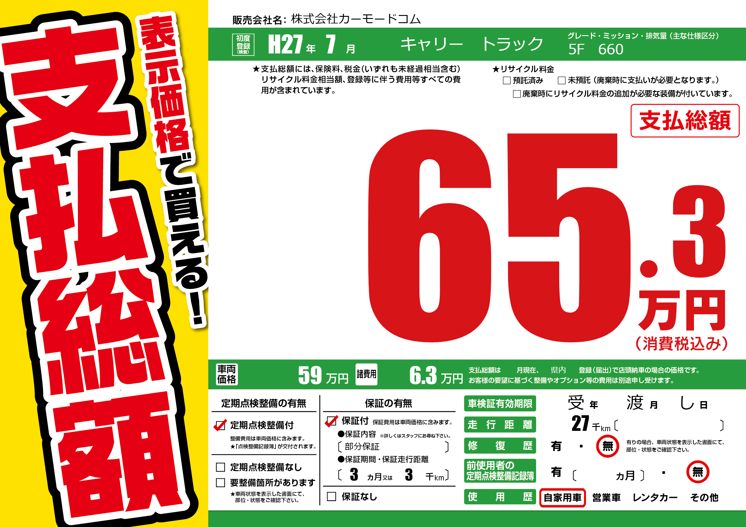 | 車名 | キャリー トラック | グレード ミッション 排気量 |