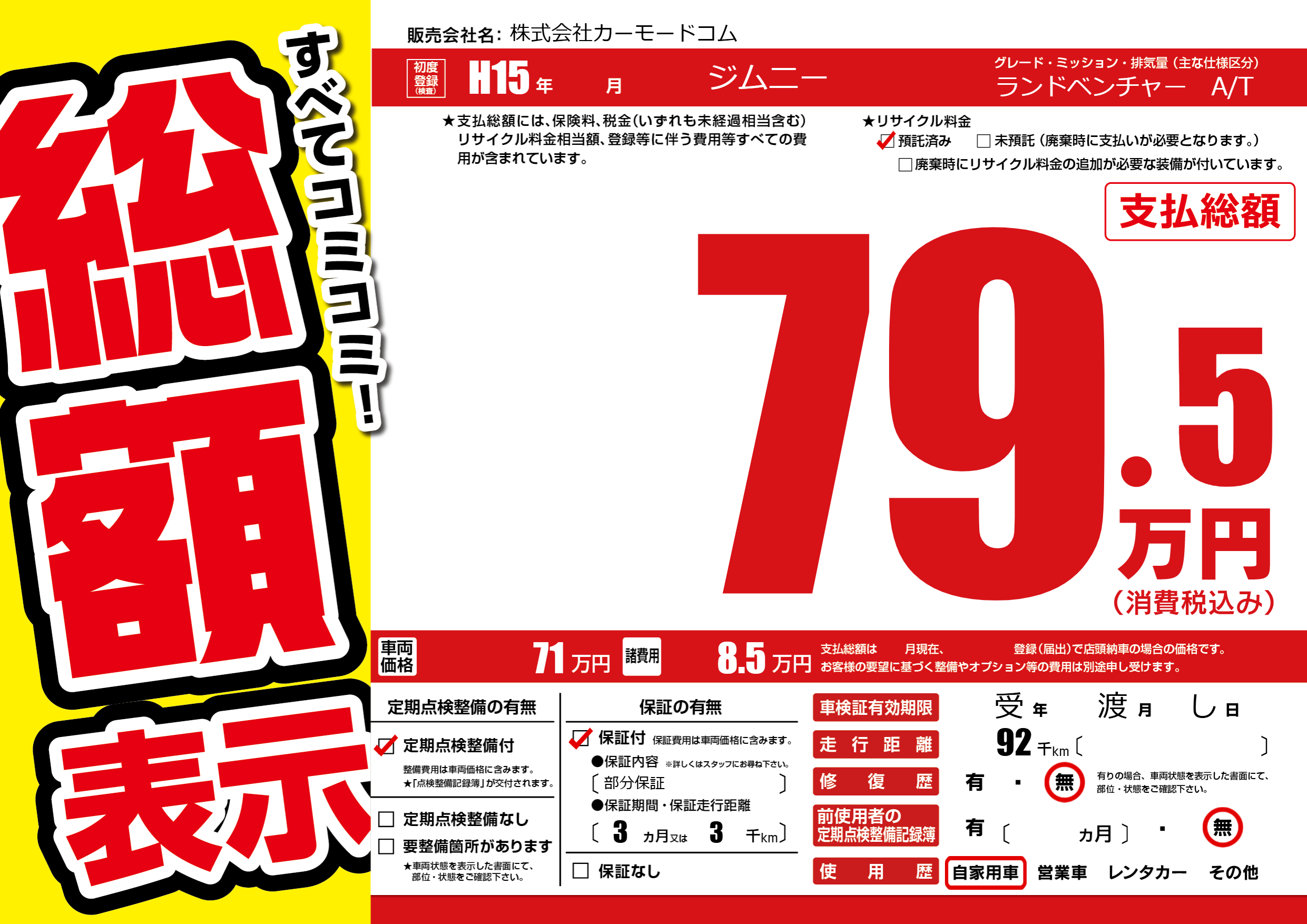 | 車名 | ジムニー | グレード ミッション 排気量 |
