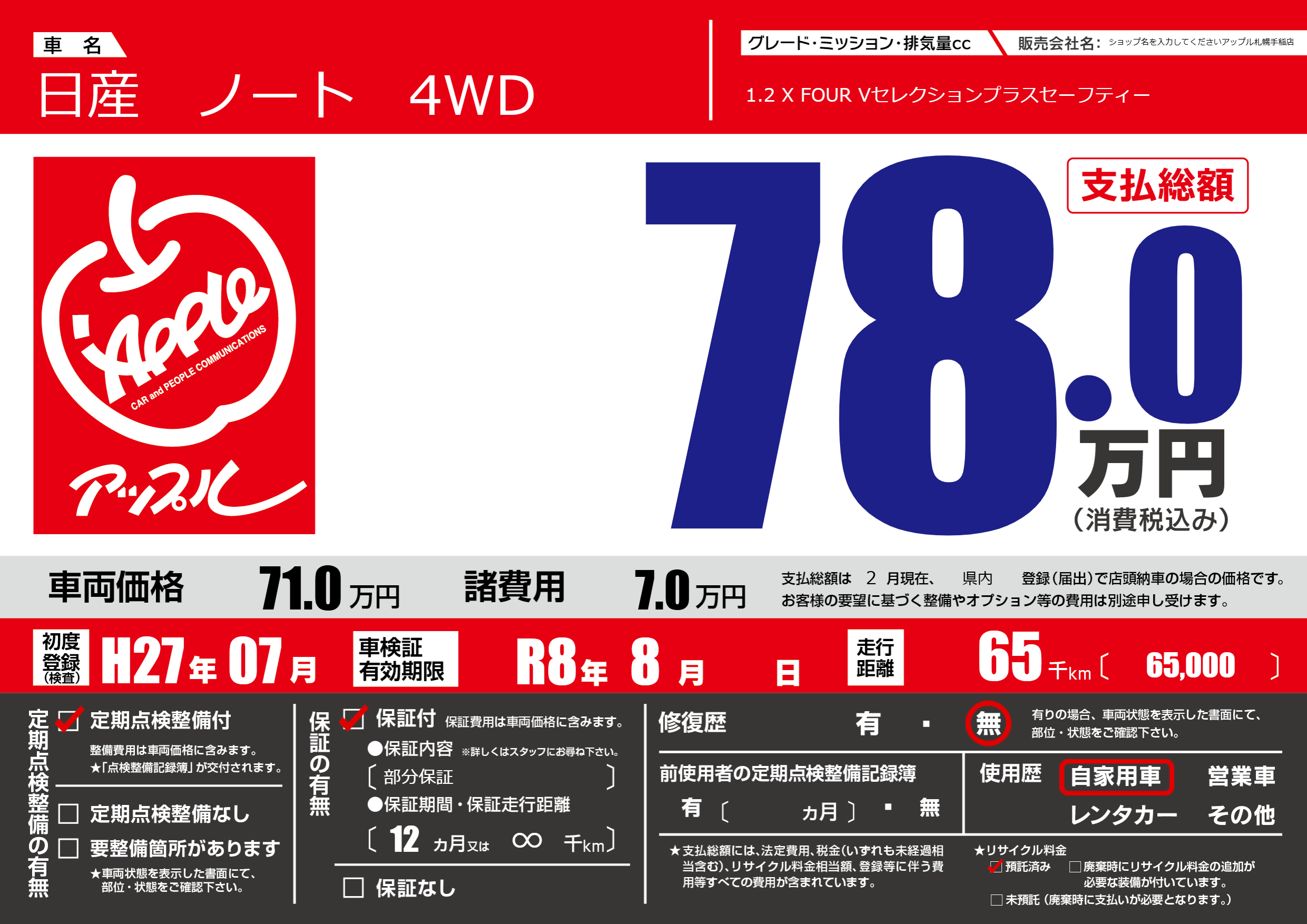 | 車名 | 日産 ノート 4WD | グレード ミッション 排気量 |