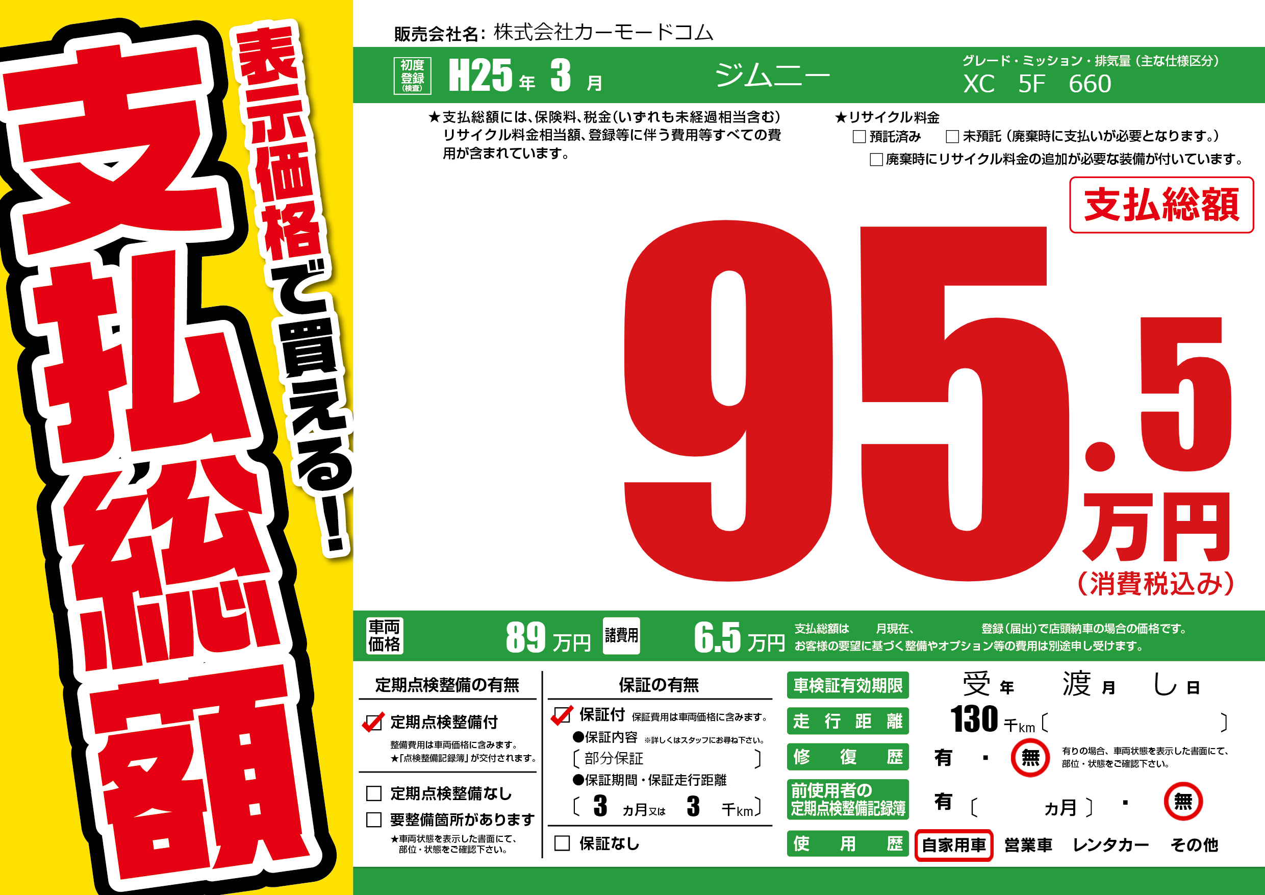 保証付き 保証内容(部分保証) 3ヶ月または(3)千kmまで |