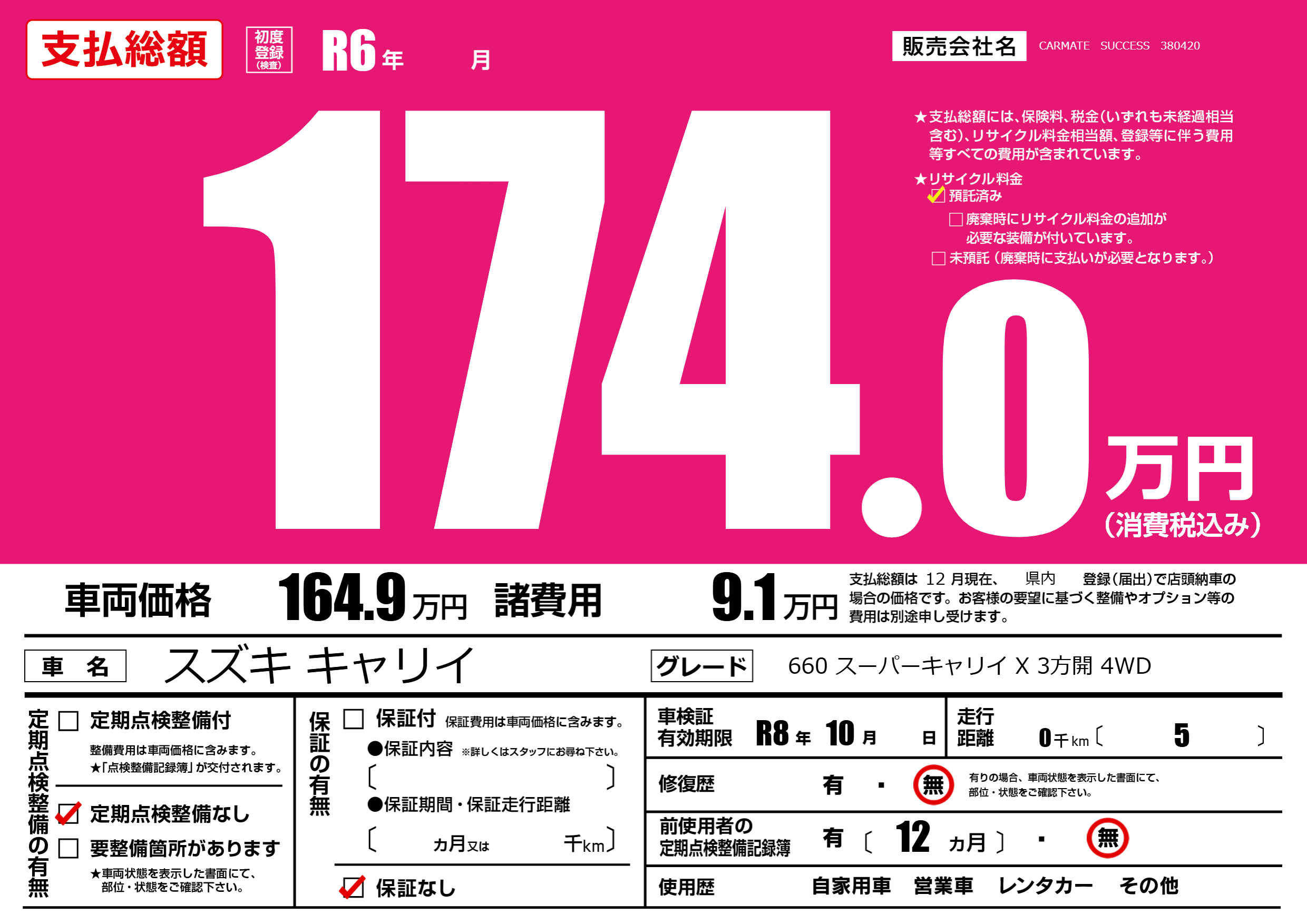 | 走行キロ | - | 初年度登録 | R6年---月 |
