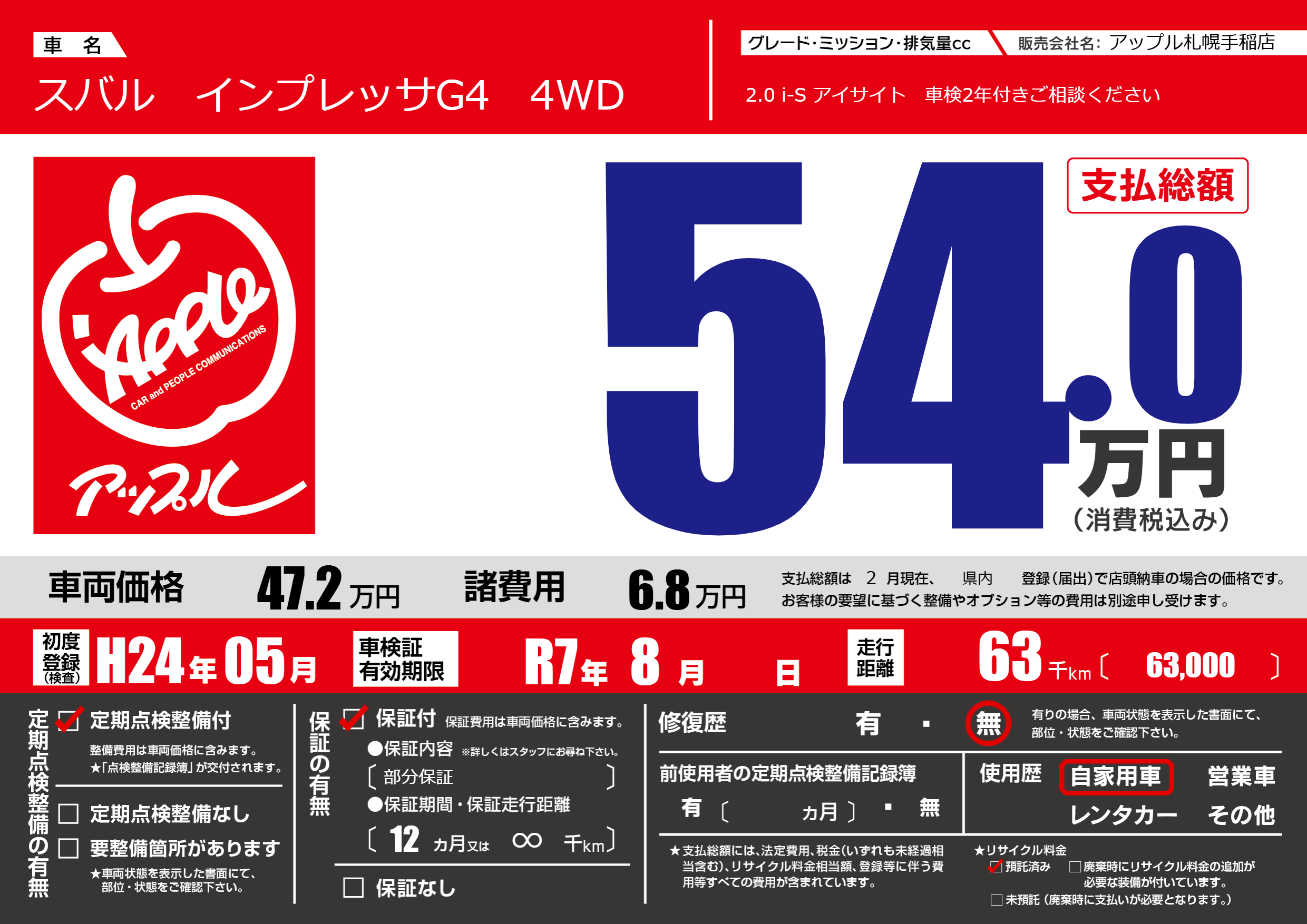 | 車名 | スバル インプレッサG4 4WD | グレード ミッション 排気量 |