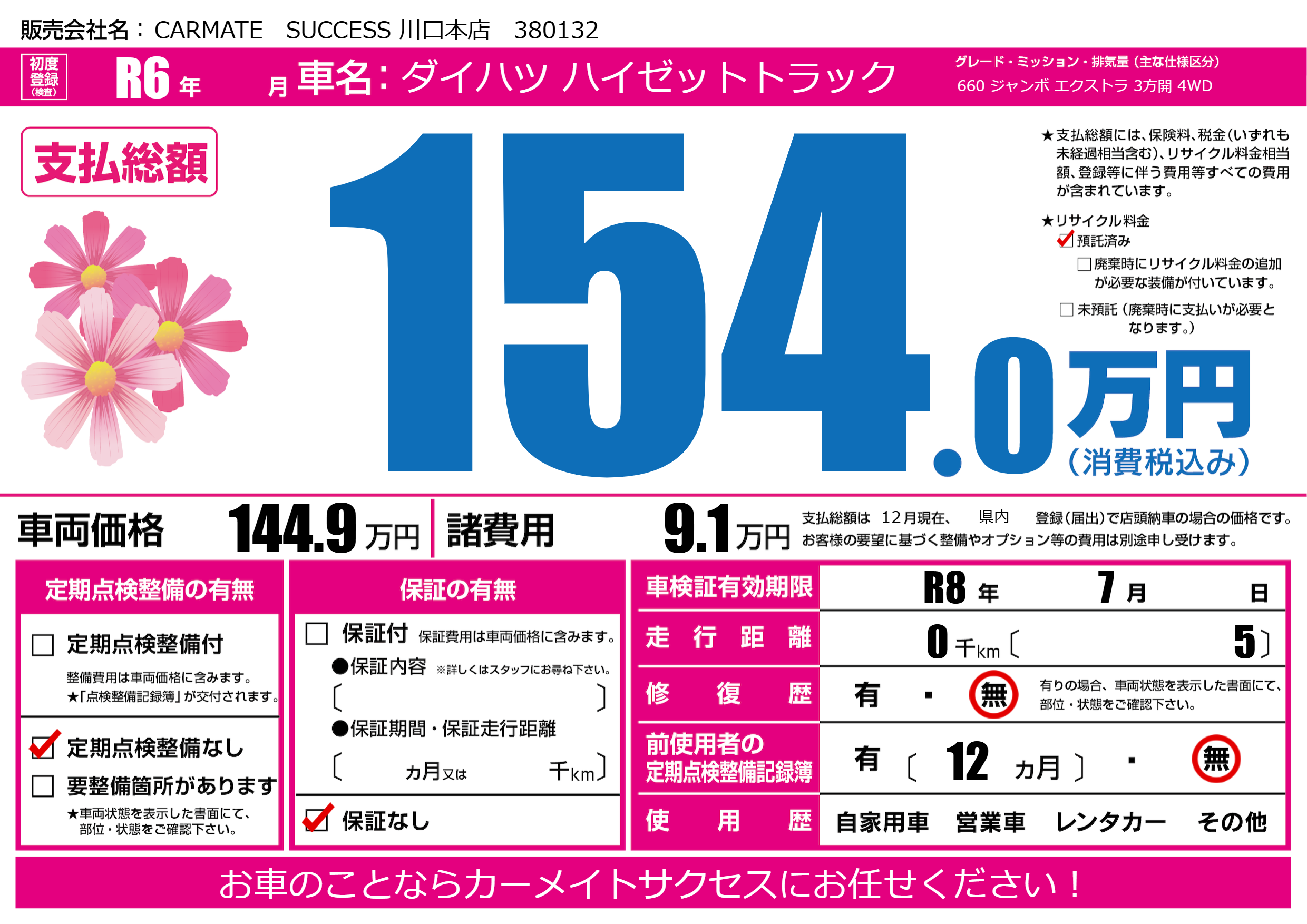 | 走行キロ | - | 初年度登録 | R6年---月 |