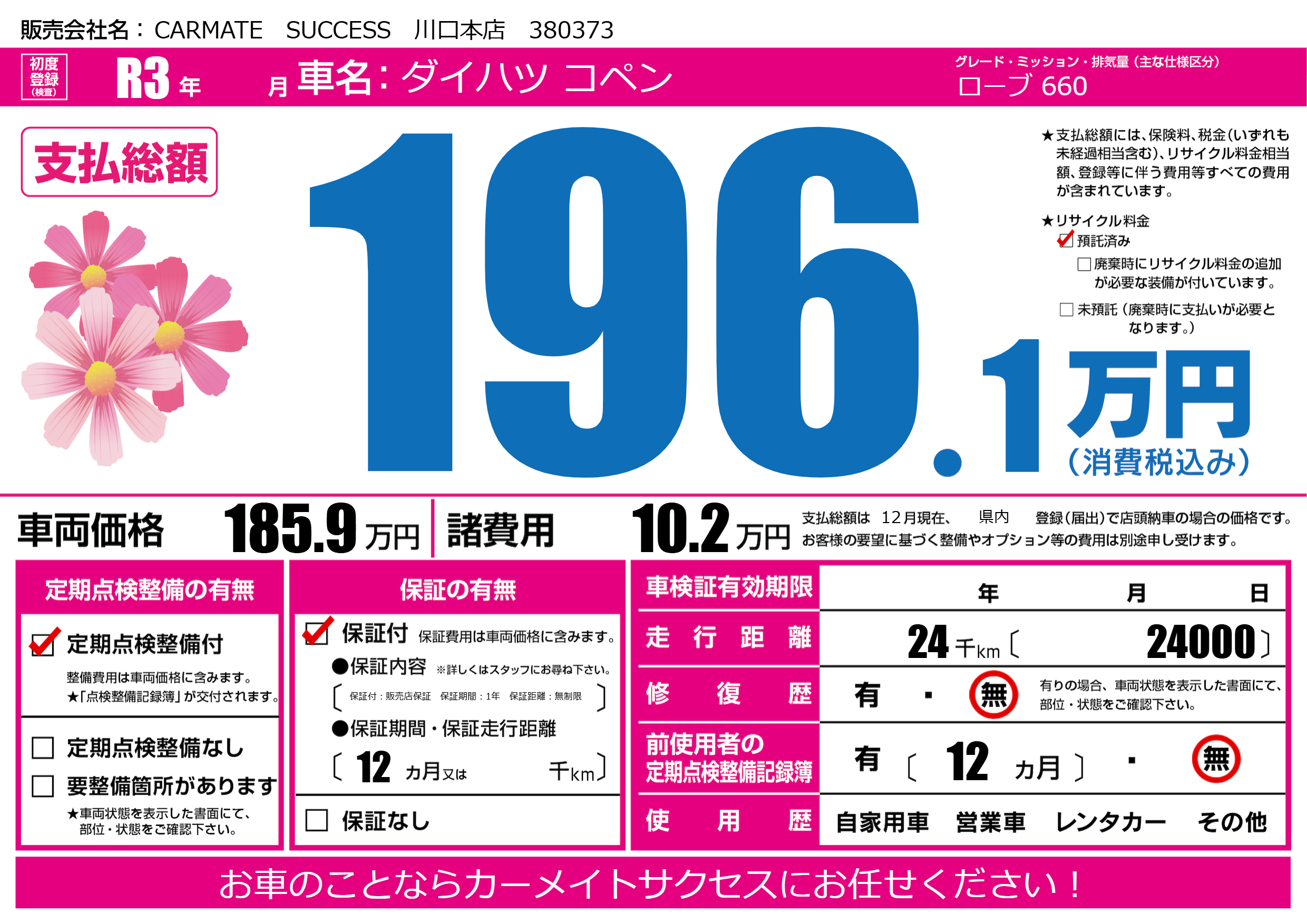 | 車名 | ダイハツ コペン | グレード ミッション 排気量 |