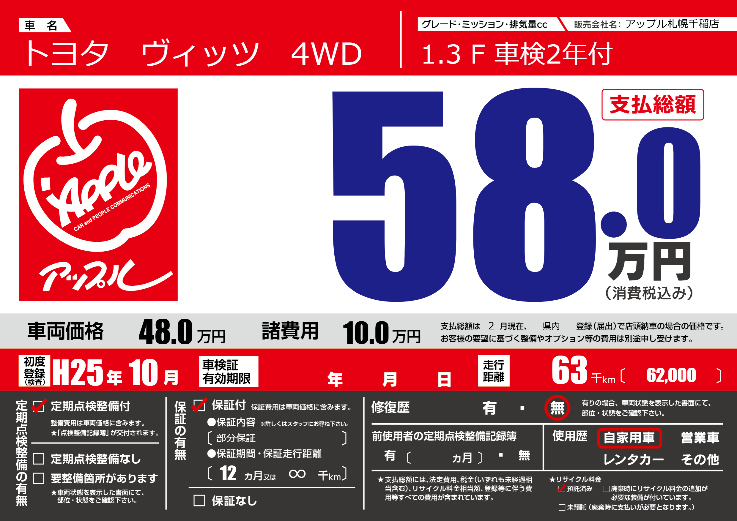 あり | リサイクル預託金相当額 | ( 0円)が別途必要 |