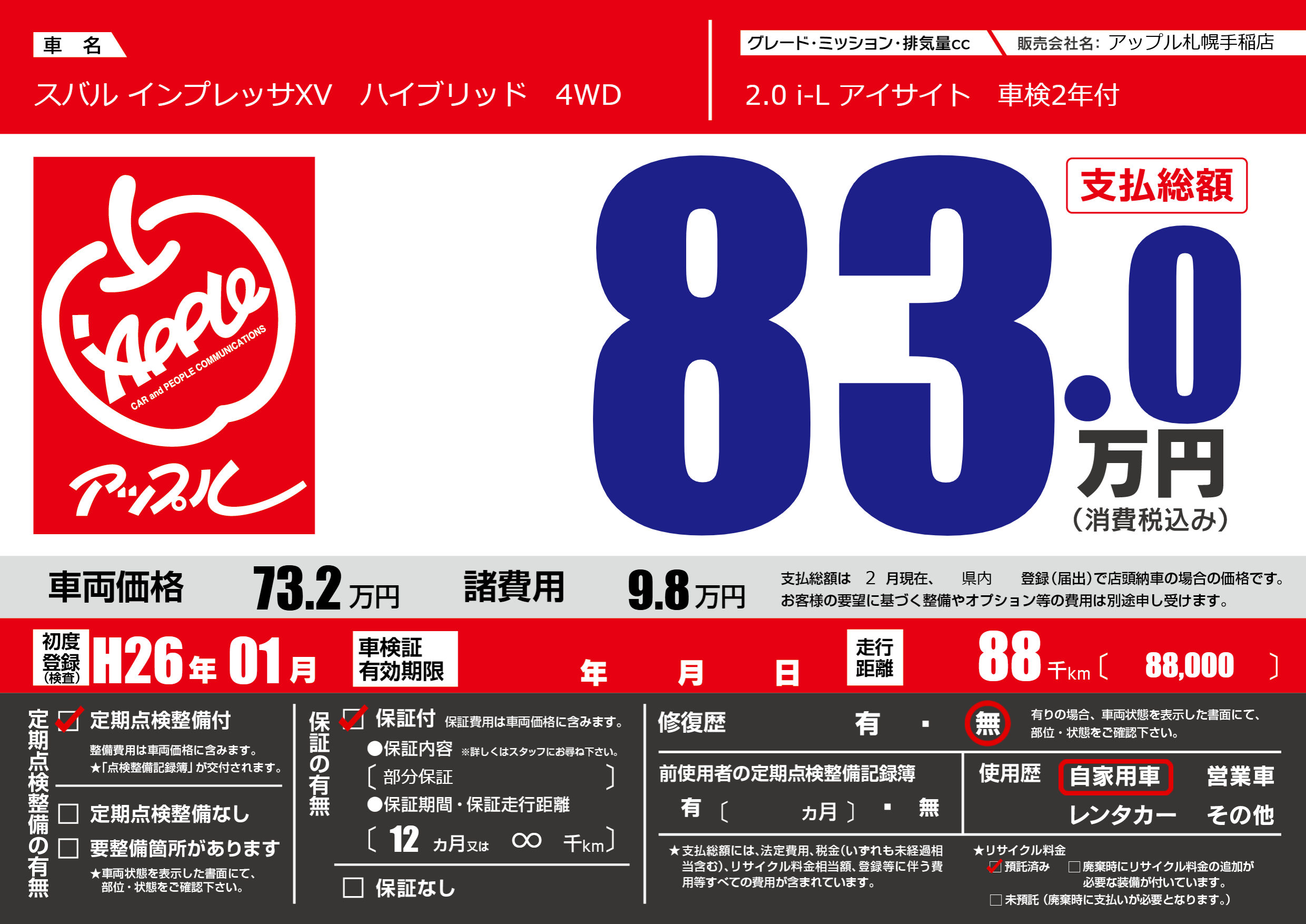 | 車名 | スバル インプレッサXV ハイブリッド 4WD | グレード ミッション 排気量 |