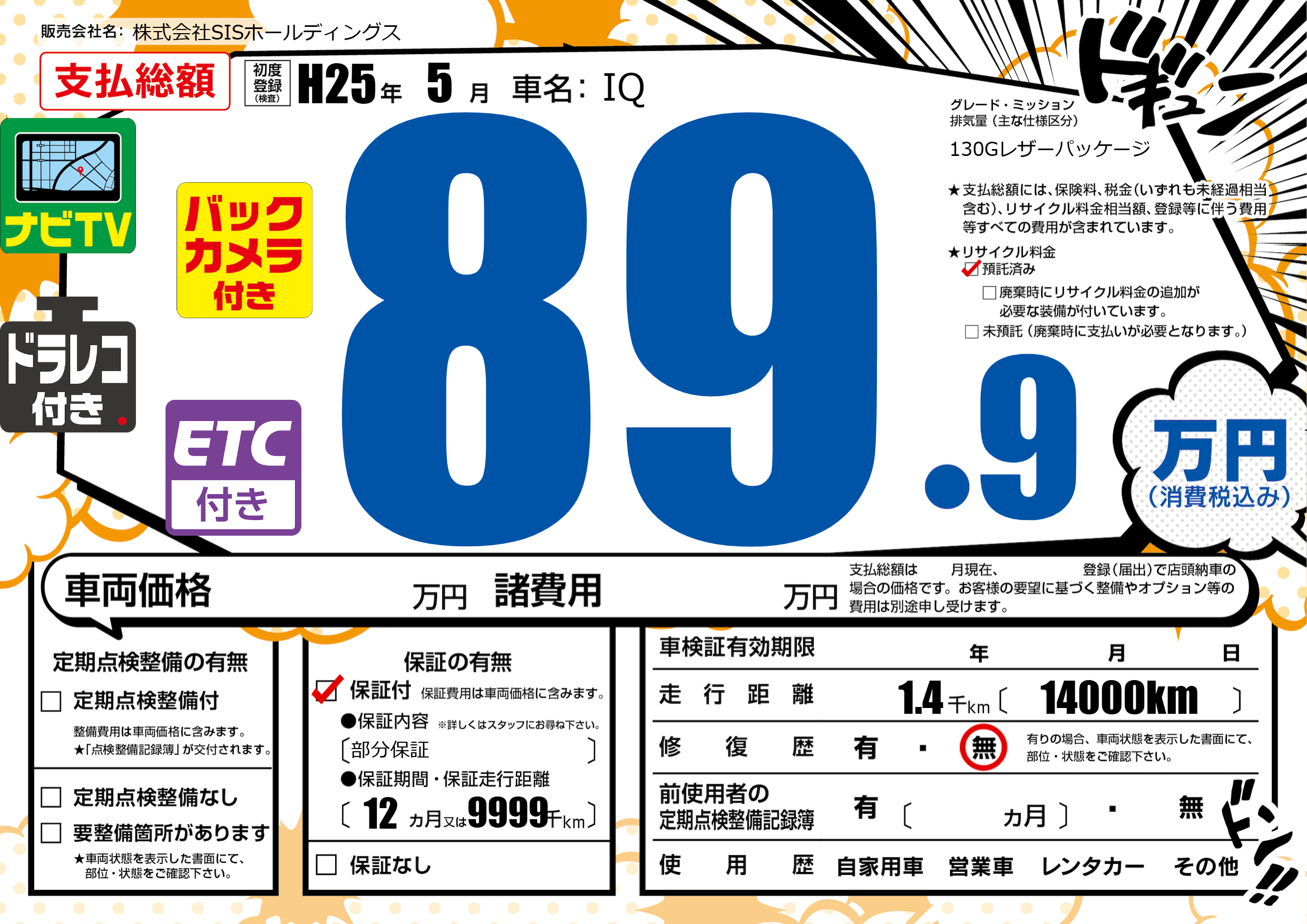 | 走行キロ | 0.1万km | 初年度登録 | H25年5月 |