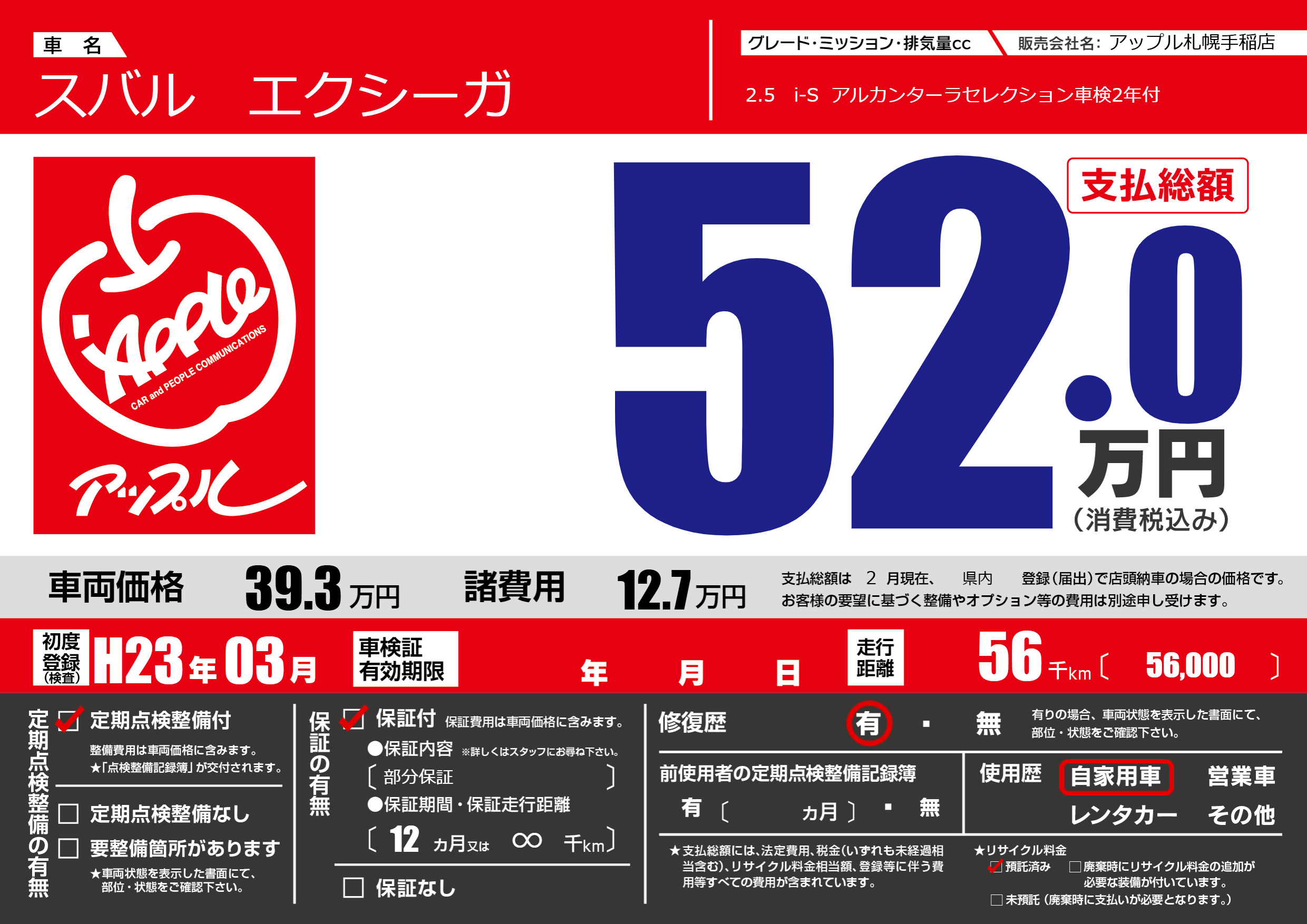 | 車名 | スバル エクシーガ | グレード ミッション 排気量 |