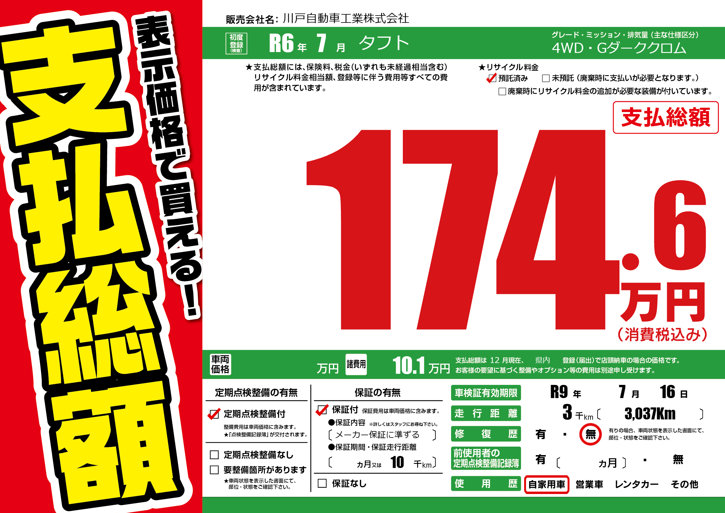| 走行キロ | 0.3万km | 初年度登録 | R6年7月 |