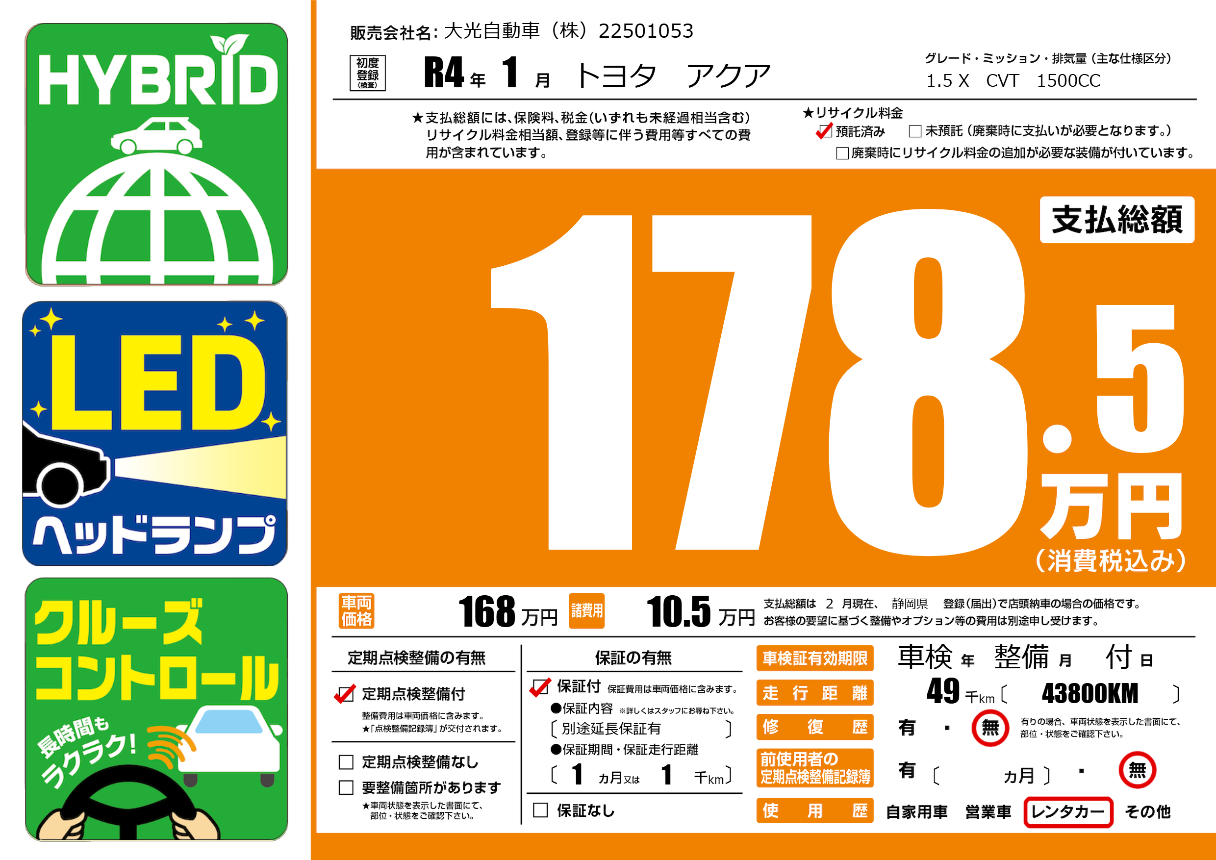 | 車名 | トヨタ アクア | グレード ミッション 排気量 |