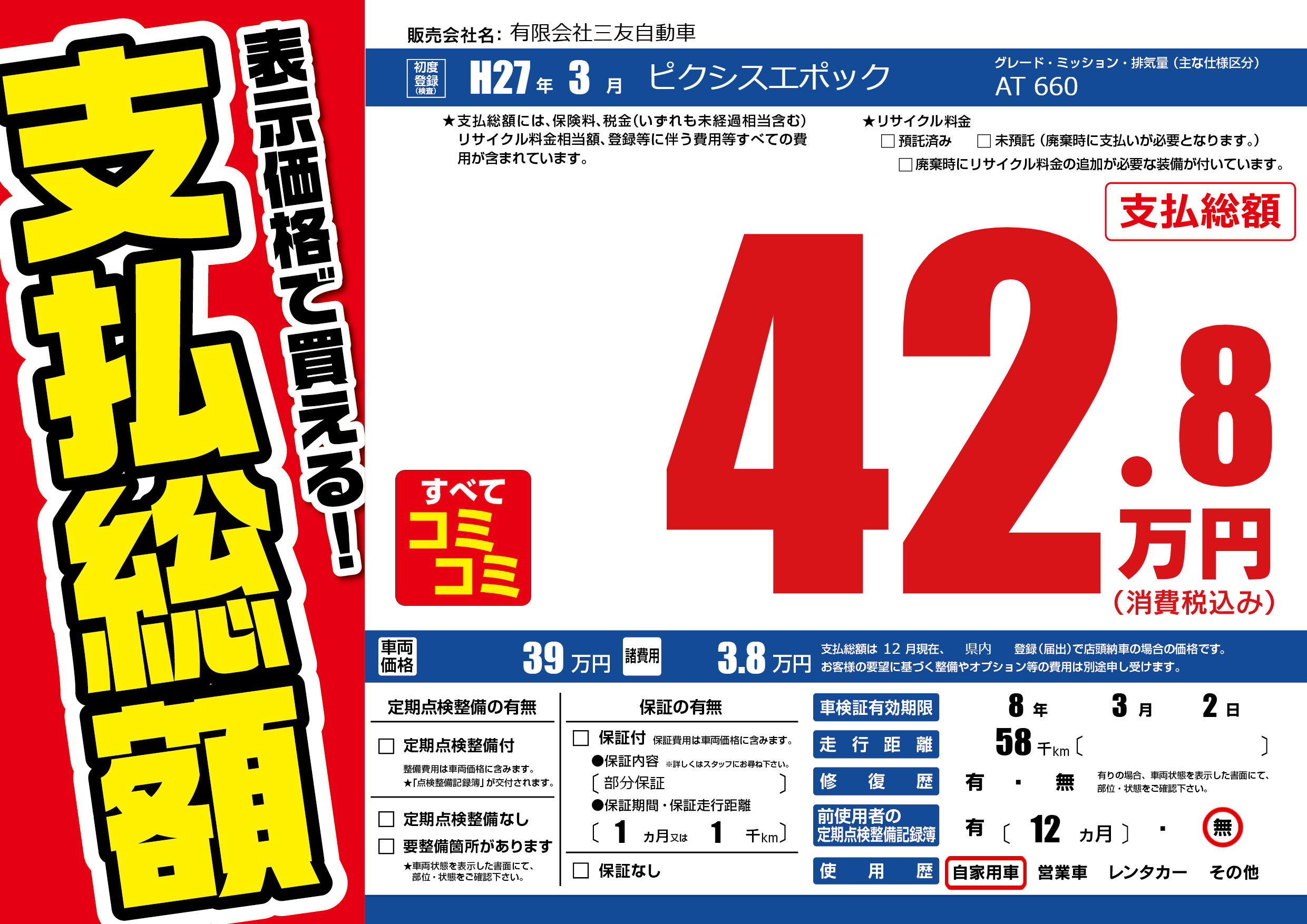 | 走行キロ | 5.8万km | 初年度登録 | H27年3月 |