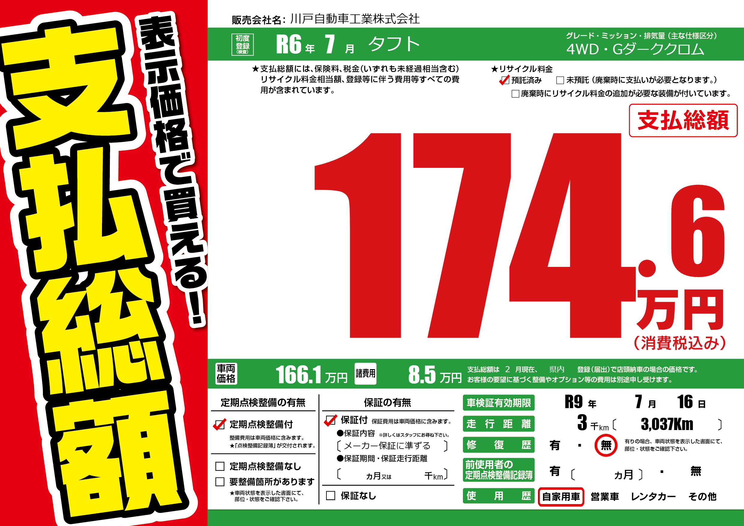 | 走行キロ | 0.3万km | 初年度登録 | R6年7月 |