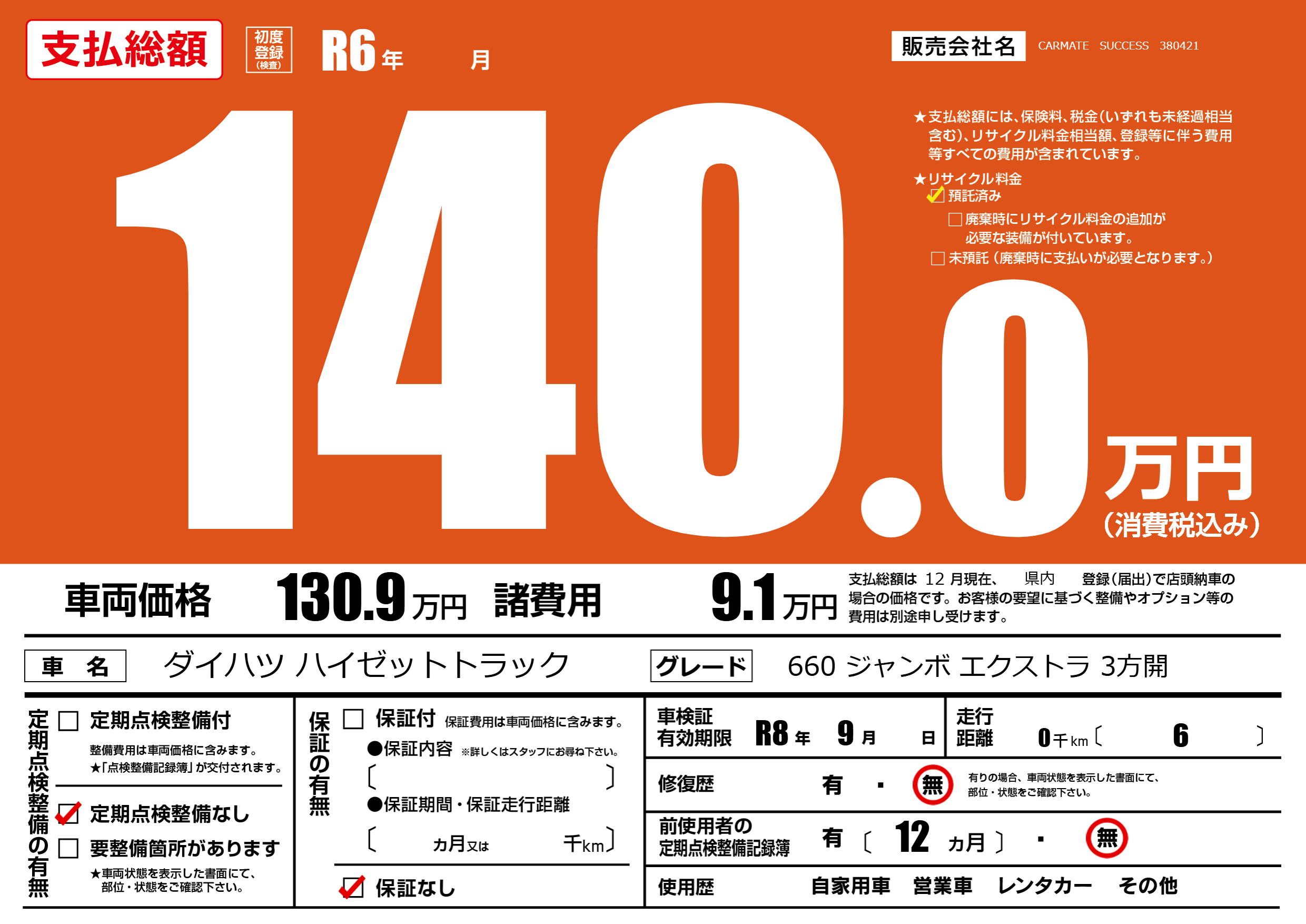 | 車名 | ダイハツ ハイゼットトラック | グレード ミッション 排気量 |