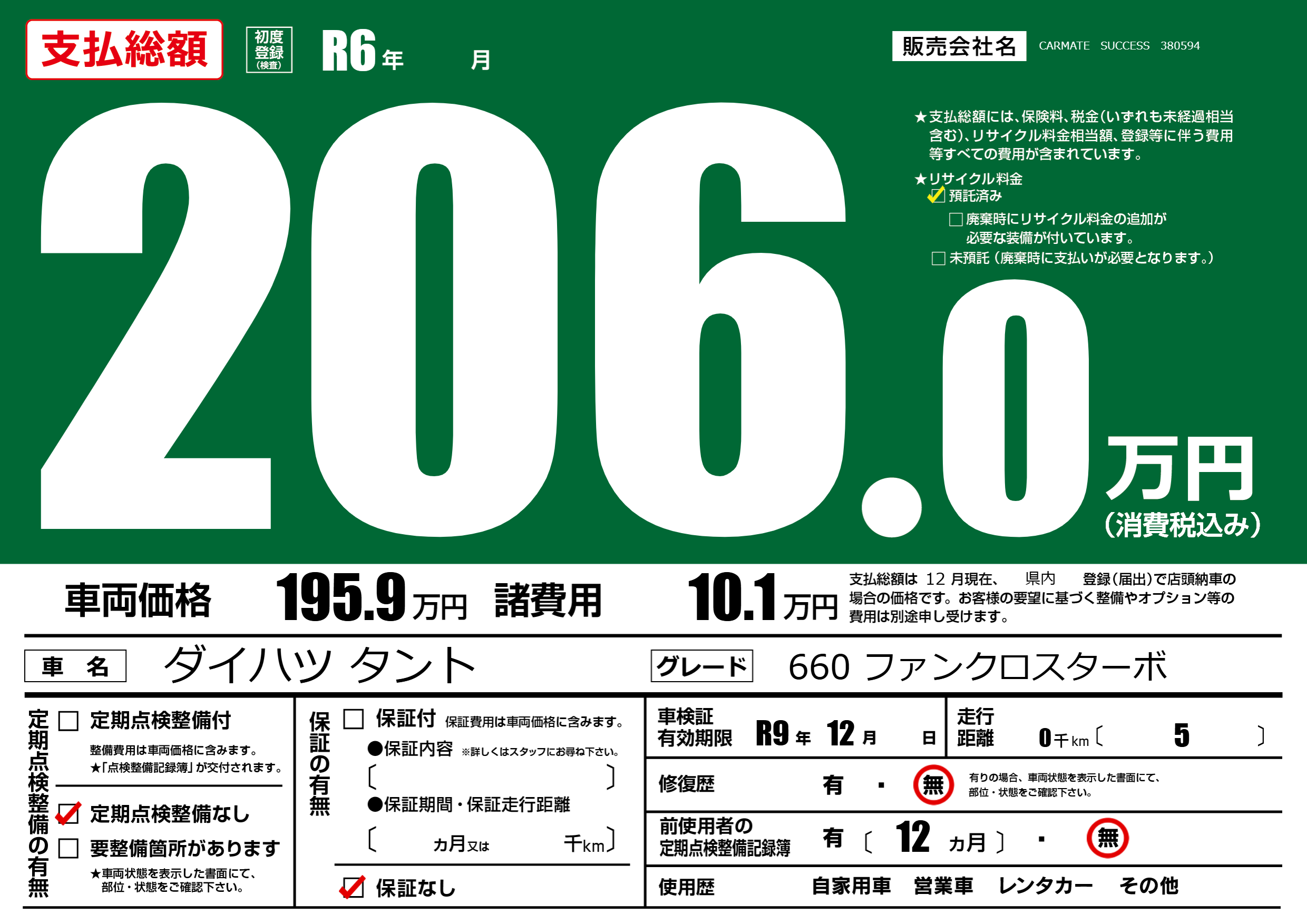 なし | 車検制限 | R9年12月---月 |