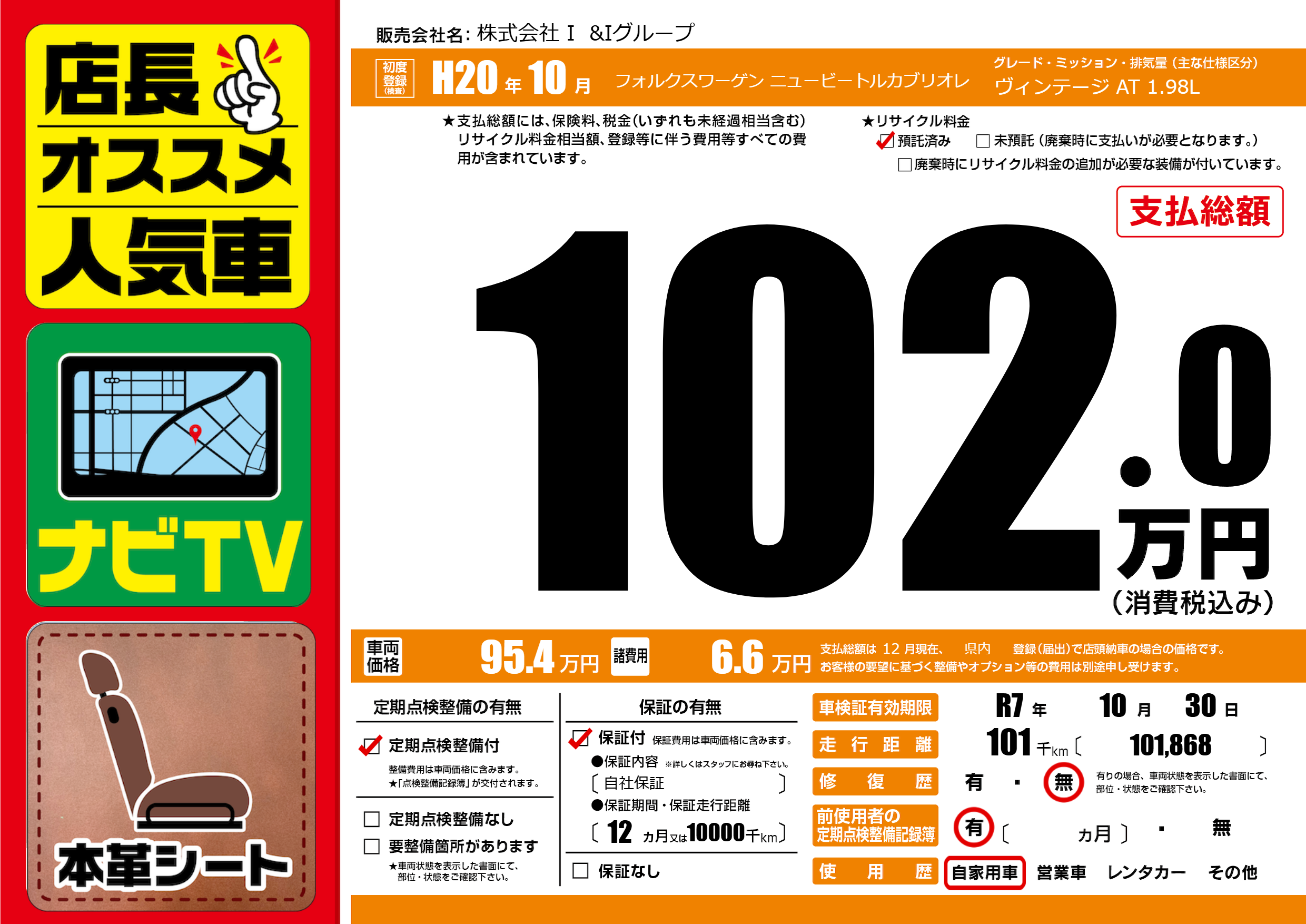 | 車名 | フォルクスワーゲン ニュービートルカブリオレ | グレード ミッション 排気量 |
