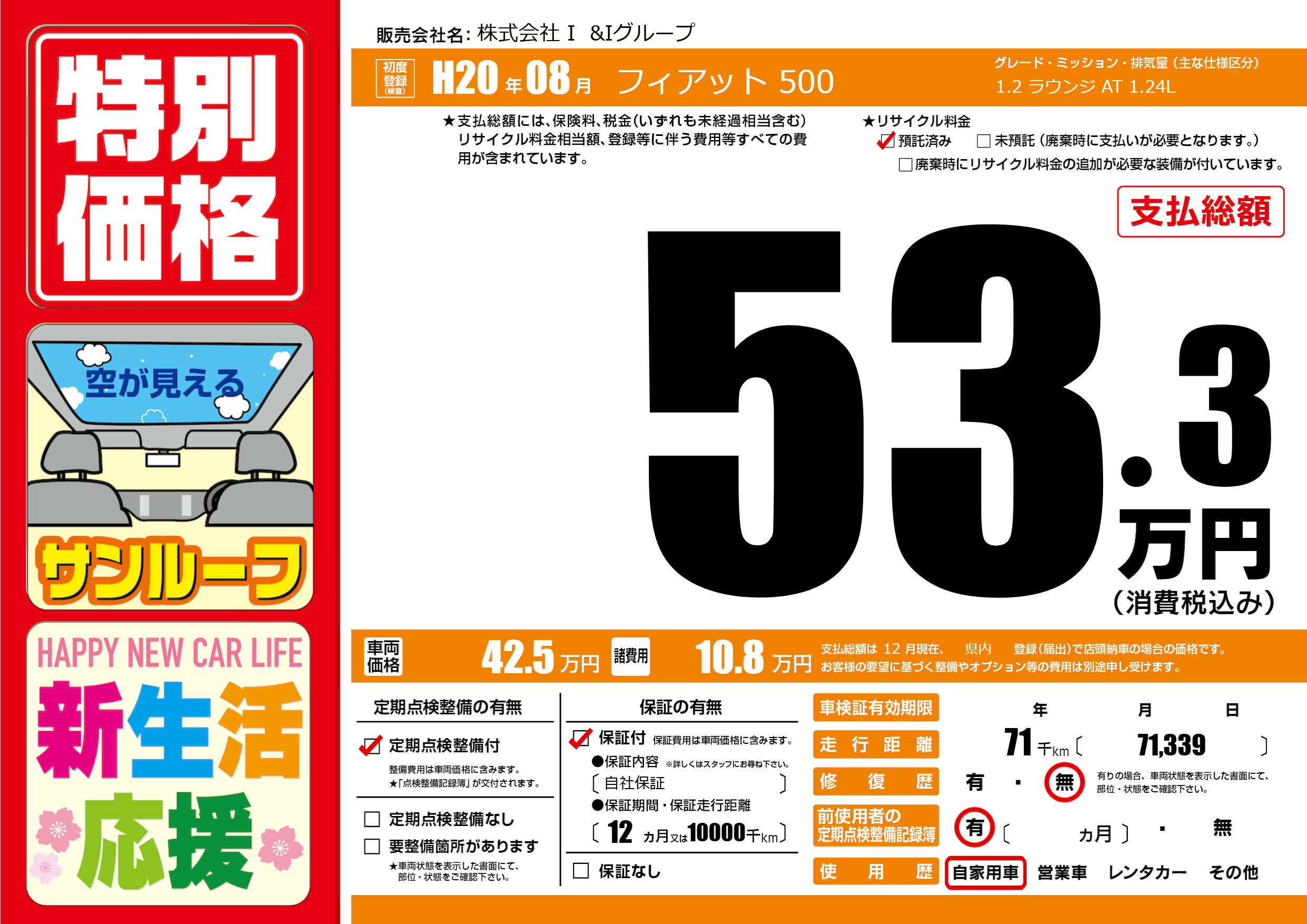 | 車名 | フィアット 500 | グレード ミッション 排気量 |