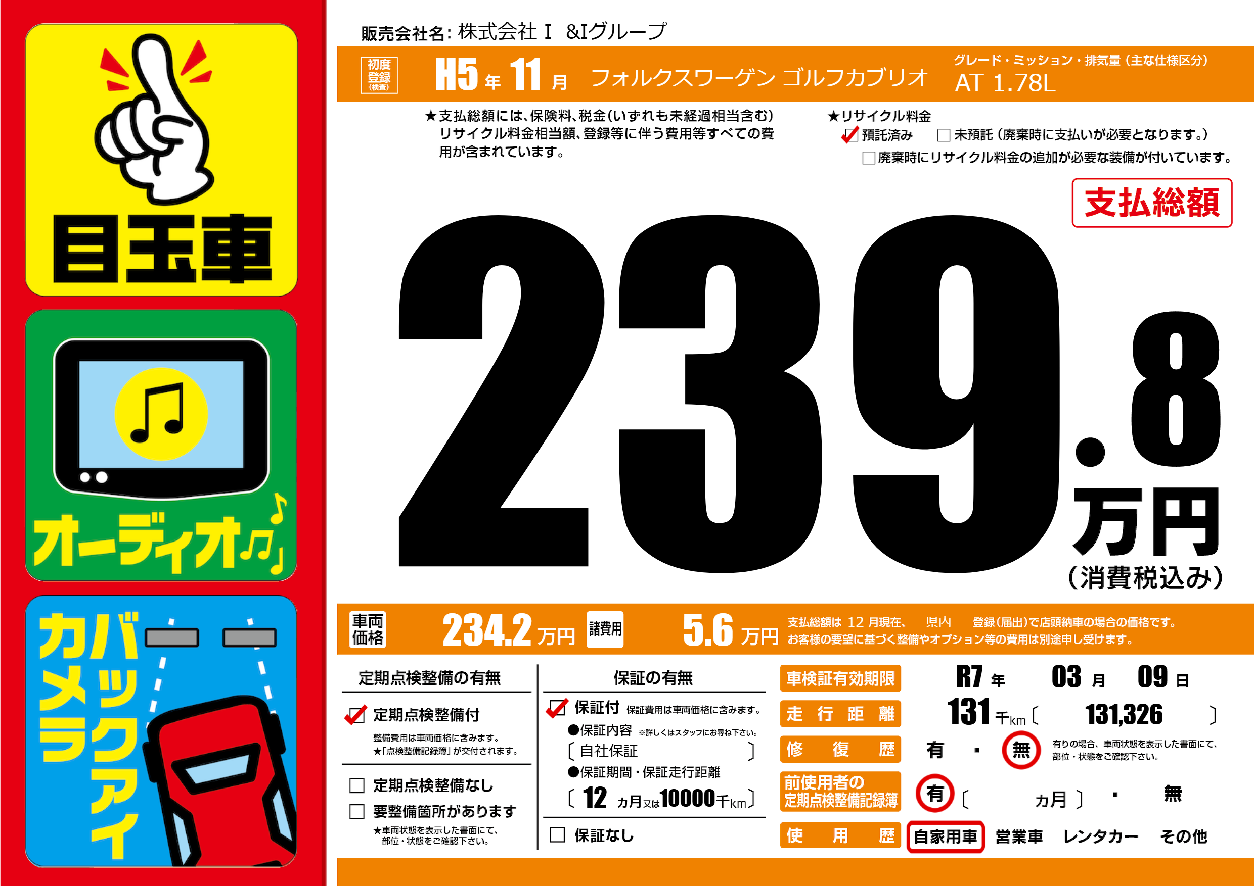 | 車名 | フォルクスワーゲン ゴルフカブリオ | グレード ミッション 排気量 |